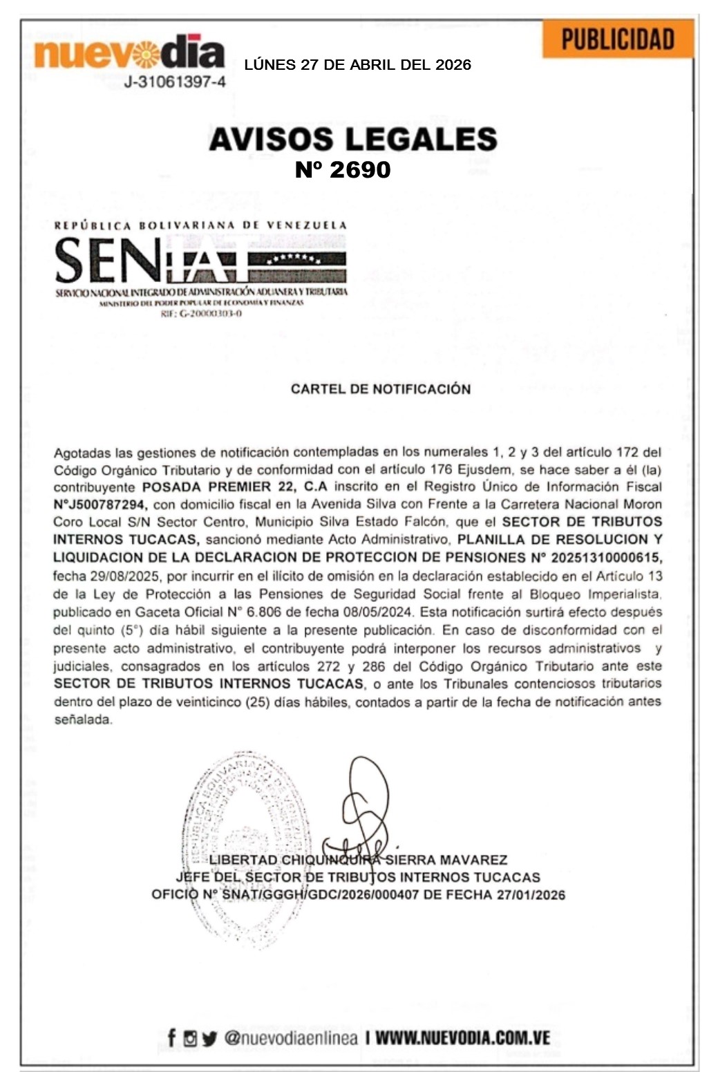 InicioPublicidadLegales PublicidadLegales Cartel de Notificación.Posada Premier 22.C.A. 27/04/2026 FacebookTwitterPinterestWhatsApp 2690. 27-04-2026 Cuota FacebookTwitterPinterestWhatsApp Artículo anteriorCartel de Notificación.Comercializadora Casa Productiva.C.A.Artículo siguienteCartel de Notificación.Posada Playa Morena.C.A. Mercadeo NuevoDia Noticias Relacionadas Legales Aviso Público.Sociedad Mercantil DARWIMAR.C.A. Legales Cartel de Notificación.Rectificación de Acta de Nacimiento.Yosmaira Milagros Montero Quevedo. Legales Edicto.Juán José Lazaro Flores. Redes Sociales20,299FansMe gusta112,425SeguidoresSeguir4,600SuscriptoresSuscribirte Últimas noticias Destacadas Venezuela se suma a la Semana de la Vacunación en las Américas Destacadas Delcy Rodríguez visita Barbados para fortalecer agenda estratégica Cargar más