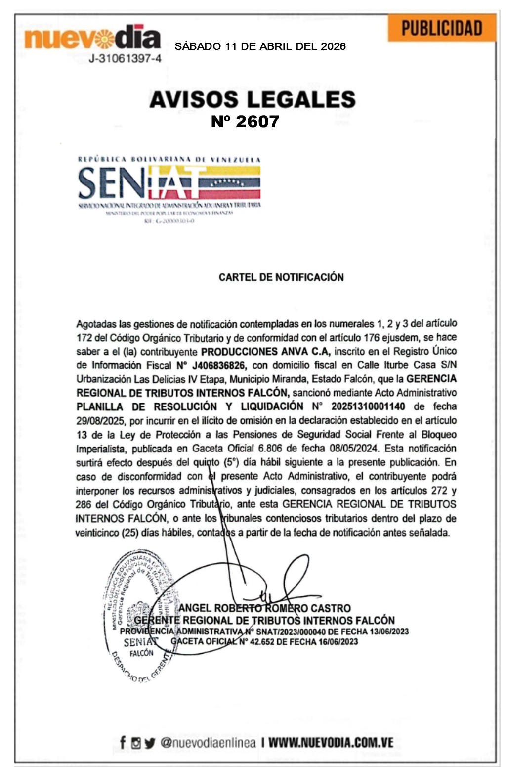 InicioPublicidadLegales PublicidadLegales Cartel de Notificación.Producciones Anva.C.A. 11/04/2026 FacebookTwitterPinterestWhatsApp 2607. 11-04-2026 Cuota FacebookTwitterPinterestWhatsApp Artículo anteriorCartel de Notificación.Multiservicios Industriales New Corp.C.A.Artículo siguienteCartel de Notificación.Transporte Robert.C.A. Mercadeo NuevoDia Noticias Relacionadas Legales Cartel de Notificación.Inversiones Jazmin.2019.C.A. Legales Cartel de Notificación.Copy Print.C.A. Legales Cartel de Notificación.Expert Inyectión Parts.C.A. Redes Sociales20,299FansMe gusta112,425SeguidoresSeguir4,600SuscriptoresSuscribirte Últimas noticias Destacadas Nuevo fiscal general se compromete a defender los derechos humanos Destacadas Maestros entregan propuestas para recuperar ingreso económico al ministro Rodríguez Cargar más