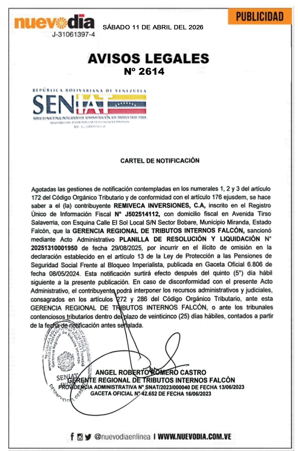 InicioPublicidadLegales PublicidadLegales Cartel de Notificación.Remiveca Inversiones.C.A. 11/04/2026 FacebookTwitterPinterestWhatsApp 2614. 11-04-2026 Cuota FacebookTwitterPinterestWhatsApp Artículo anteriorCartel de Notificación.Inversiones F.S.R.C.A. Charcutería La Franqueza.Artículo siguienteCartel de Notificación.Expert Inyectión Parts.C.A. Mercadeo NuevoDia Noticias Relacionadas Legales Cartel de Notificación.Inversiones Jazmin.2019.C.A. Legales Cartel de Notificación.Copy Print.C.A. Legales Cartel de Notificación.Expert Inyectión Parts.C.A. Redes Sociales20,299FansMe gusta112,425SeguidoresSeguir4,600SuscriptoresSuscribirte Últimas noticias Destacadas Jorge Arreaza: Ley de Amnistía ha beneficiado a más de 8.000 personas Destacadas Nuevo fiscal general se compromete a defender los derechos humanos Cargar más