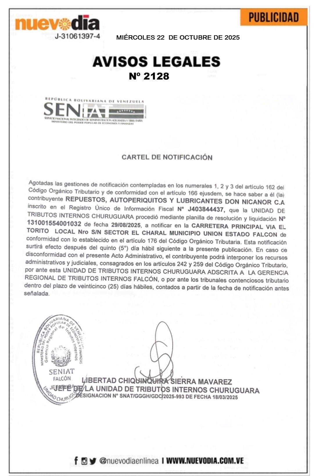 InicioPublicidadLegales PublicidadLegales Cartel de Notificación.Repuestos, Autoperiquitos y Lubricantes Don Nicanor, C.A. 22/10/2025 FacebookTwitterPinterestWhatsApp 2128. 22-10-2025 Cuota FacebookTwitterPinterestWhatsApp Artículo anteriorCartel de Notificación.Multiservicios Santa Ines, C.A.Artículo siguienteCartel de Notificación.Panadería, Pastelería y Charcutería La Reina 2020,C.A. Mercadeo NuevoDia Noticias Relacionadas Legales Cartel de Notificación.Automercado Virgen del Carmen, C.A. Legales Cartel de Notificación.Samor,C.A. Legales Cartel de Notificación.Agrototal 2019,C.A. Redes Sociales20,299FansMe gusta112,425SeguidoresSeguir4,600SuscriptoresSuscribirte Últimas noticias Destacadas PDVSA factura $ 11.700 millones en nueve meses por exportaciones petroleras Destacadas Trasladan fiesta de los santos a parroquias por gran cantidad de fieles (COMUNICADO) Cargar más