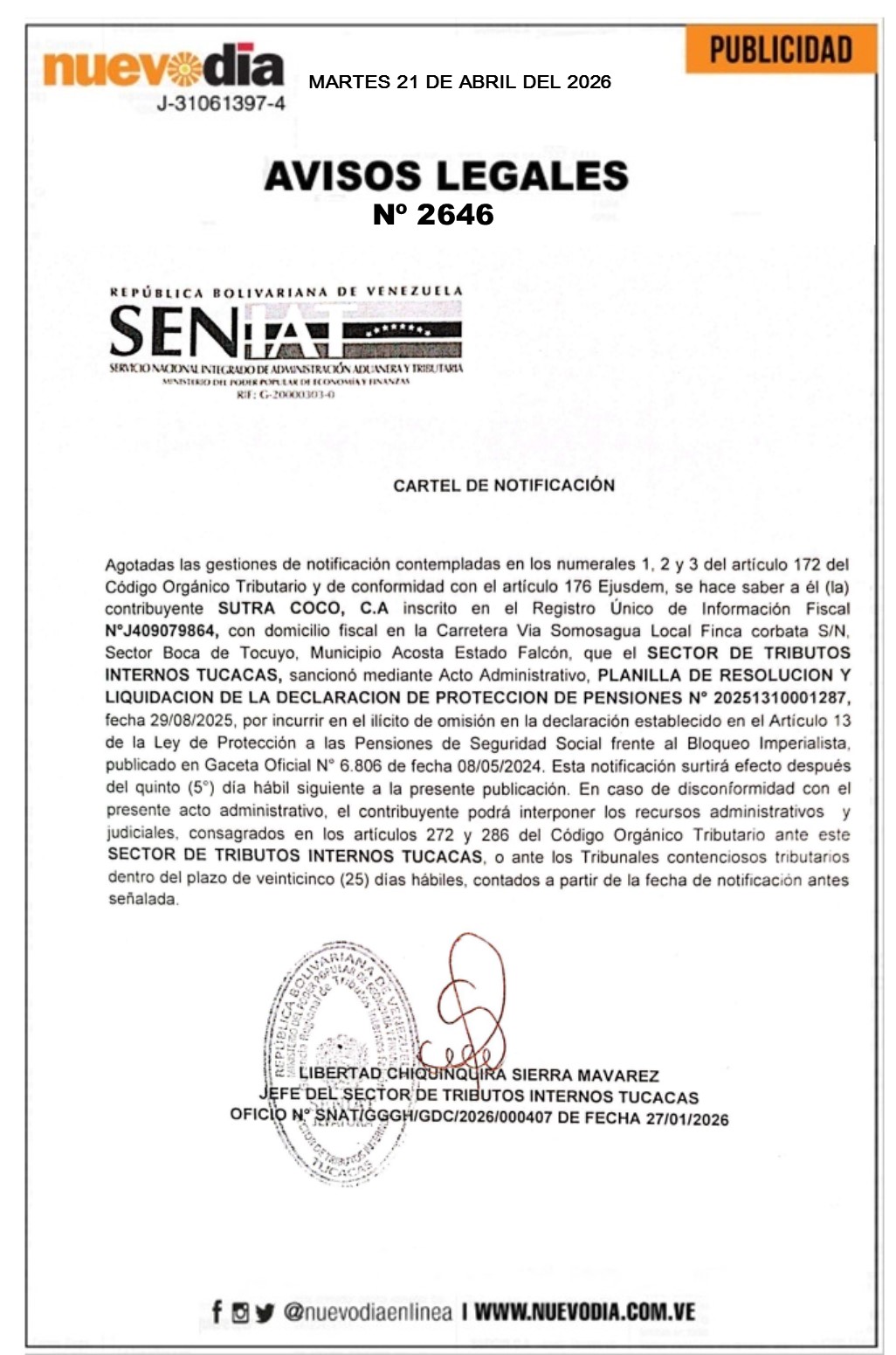 InicioPublicidadLegales PublicidadLegales Cartel de Notificación.Sutra Coco.C.A. 21/04/2026 FacebookTwitterPinterestWhatsApp 2646. 21-04-2026 Cuota FacebookTwitterPinterestWhatsApp Artículo anteriorCartel de Notificación.Agropecuaria Reus.C.a.Artículo siguienteCartel de Notificación.Abasto.Carnicería y Charcutería Bremo.C.A. Mercadeo NuevoDia Noticias Relacionadas Legales Cartel de Notificación.Brisas de Chichiriviche.C.A. Legales Cartel de Notificación.KBA Styles Moda.C.A. Legales Cartel de Notificación.Grupo Arteinmueble.C.A. Redes Sociales20,299FansMe gusta112,425SeguidoresSeguir4,600SuscriptoresSuscribirte Últimas noticias Destacadas AN prepara selección del comité encargado de evaluar aspirantes a magistrados del TSJ Destacadas Jorge Arreaza: María Corina no aplica para ser beneficiada por la Ley de Amnistía Cargar más