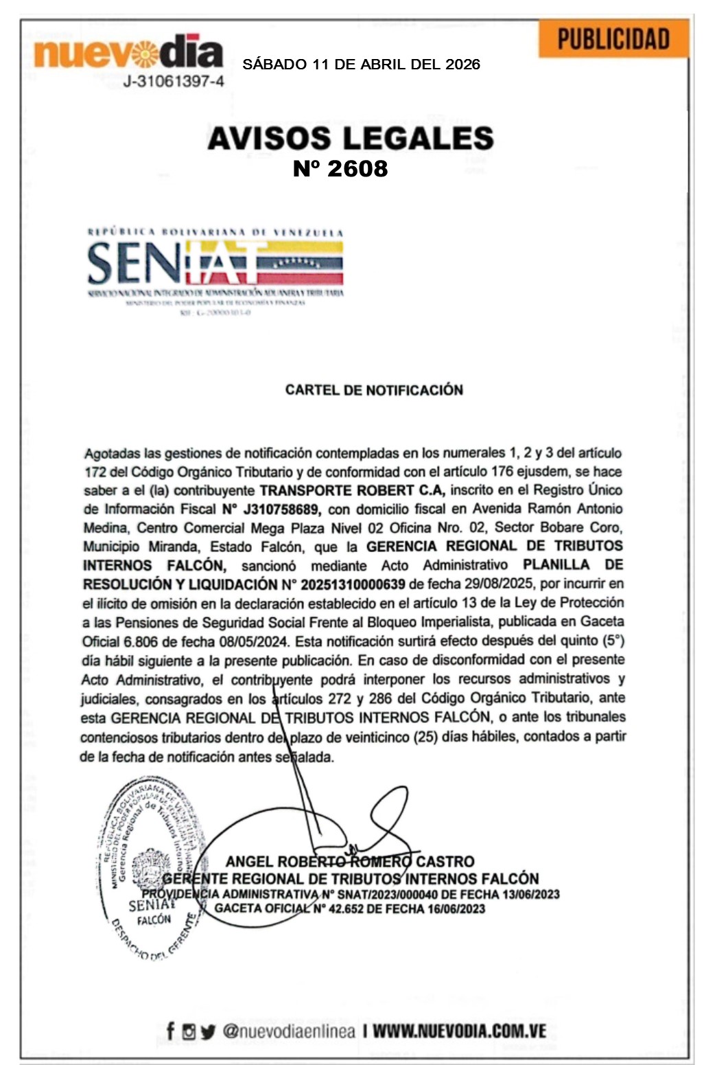 InicioPublicidadLegales PublicidadLegales Cartel de Notificación.Transporte Robert.C.A. 11/04/2026 FacebookTwitterPinterestWhatsApp 2608. 11-04-2026 Cuota FacebookTwitterPinterestWhatsApp Artículo anteriorCartel de Notificación.Producciones Anva.C.A.Artículo siguienteCartel de Notificación.Inversiones Reyes Moreno.C.A. Mercadeo NuevoDia Noticias Relacionadas Legales Cartel de Notificación.Inversiones Jazmin.2019.C.A. Legales Cartel de Notificación.Copy Print.C.A. Legales Cartel de Notificación.Expert Inyectión Parts.C.A. Redes Sociales20,299FansMe gusta112,425SeguidoresSeguir4,600SuscriptoresSuscribirte Últimas noticias Destacadas Nuevo fiscal general se compromete a defender los derechos humanos Destacadas Maestros entregan propuestas para recuperar ingreso económico al ministro Rodríguez Cargar más