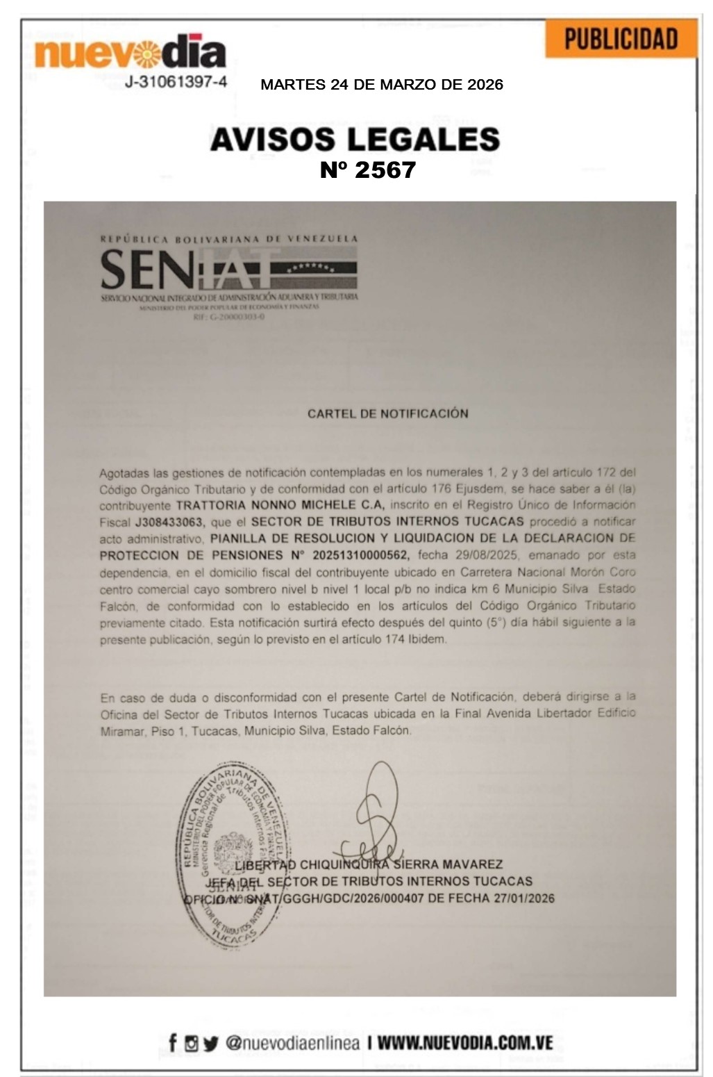 InicioPublicidadLegales PublicidadLegales Cartel de Notificación.Trattoria Nonno Michele.C.A. 24/03/2026 FacebookTwitterPinterestWhatsApp 2567. 24-03-2026 Cuota FacebookTwitterPinterestWhatsApp Artículo anteriorColombia | Accidente aéreo dejó 66 fallecidos y 57 sobrevivientesArtículo siguienteCartel de Notificación.Distribuidora de Alimentos Tamaran.C.A. Mercadeo NuevoDia Noticias Relacionadas Legales Convocatoria.Asamblea Ordinaria de Copropietarios.Condominio Residencial Alcatraz. Legales Convocatoria.Asamblea Ordinaria.Miembros Asociación Civil Universidad de Falcón. Legales Cartel de Notificación.Distribuidora de Alimentos Tamaran.C.A. Redes Sociales20,299FansMe gusta112,425SeguidoresSeguir4,600SuscriptoresSuscribirte Últimas noticias Destacadas Falcón entre los estados más afectados por altas temperaturas Destacadas Reporte del Inameh: Lluvias y calor extremo hoy 24-Mar +DETALLES Cargar más