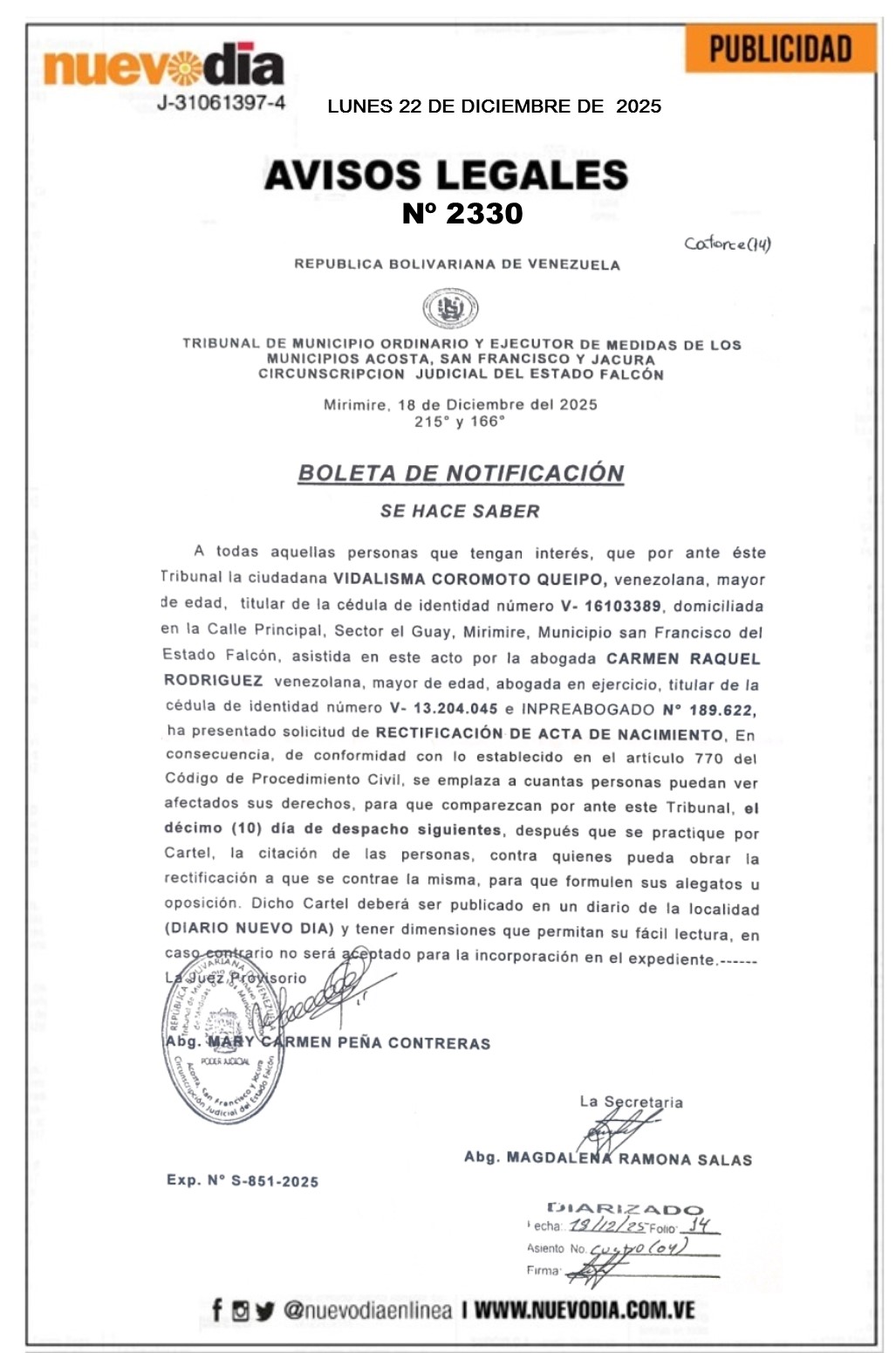 InicioPublicidadLegales PublicidadLegales Cartel de Notificación.Vidalisma Coromoto Queipo. 22/12/2025 FacebookTwitterPinterestWhatsApp 2330. 22-12-2025 Cuota FacebookTwitterPinterestWhatsApp Artículo anteriorBravos y Cardenales clasificados al Round Robin 25-26Artículo siguienteCartel de Notificación.Jeremia Antonio Queipo. Mercadeo NuevoDia Noticias Relacionadas Legales Cartel de Notificación.Jeremia Antonio Queipo. Legales Cartel de Notificación.Oswaldo Arcangel Sánchez Bravo. Legales Edicto.Miguel Segundo Nava. Redes Sociales20,299FansMe gusta112,425SeguidoresSeguir4,600SuscriptoresSuscribirte Últimas noticias Destacadas Buque de Chevron zarpó con petróleo venezolano a EE.UU. Destacadas Así inicia el precio del dólar esta semana Cargar más