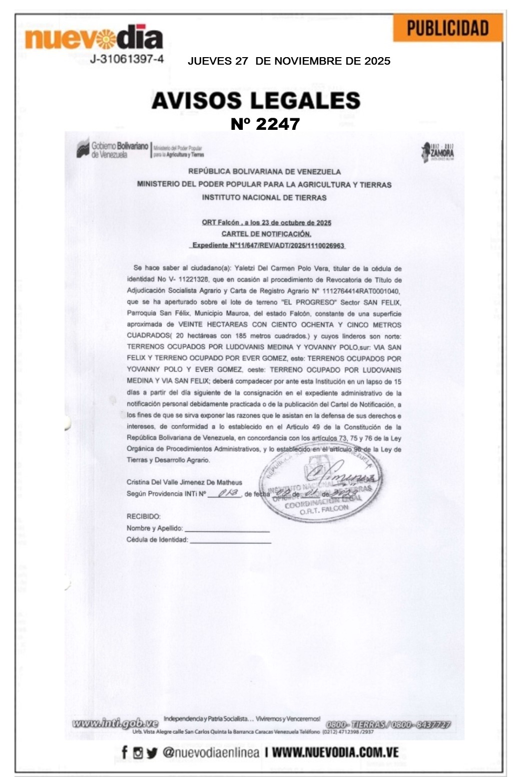 InicioPublicidad Publicidad Cartel de Notificación.Yaletzi del Carmen Polo Vera. 27/11/2025 FacebookTwitterPinterestWhatsApp 2247. 27-11-2025 Cuota FacebookTwitterPinterestWhatsApp Artículo anteriorCartel de Notificación.Ever María Gómez Villalobos.Artículo siguiente¿Cristiano Ronaldo en MMA? Acá los detalles de este proyecto Mercadeo NuevoDia Noticias Relacionadas Legales Cartel de Notificación.Yovanny Omar Polo Vera. Legales Cartel de Notificación.Ever María Gómez Villalobos. Legales Edicto.Juan Bautista López. Redes Sociales20,299FansMe gusta112,425SeguidoresSeguir4,600SuscriptoresSuscribirte Últimas noticias Destacadas Maduro: «82% de los venezolanos dicen que están dispuestos a defender su patria sagrada» Destacadas Revocan concesión a seis aerolíneas internacionales por suspensión de vuelos Cargar más
