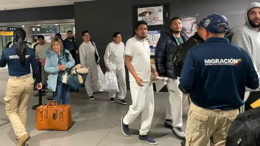 La publicación está acompañada de tres fotografías de personas vestidas con sudadera gris, recibidas en el aeropuerto internacional El Dorado de Bogotá por funcionarios de Migración Colombia y de la Cruz Roja Colombiana.