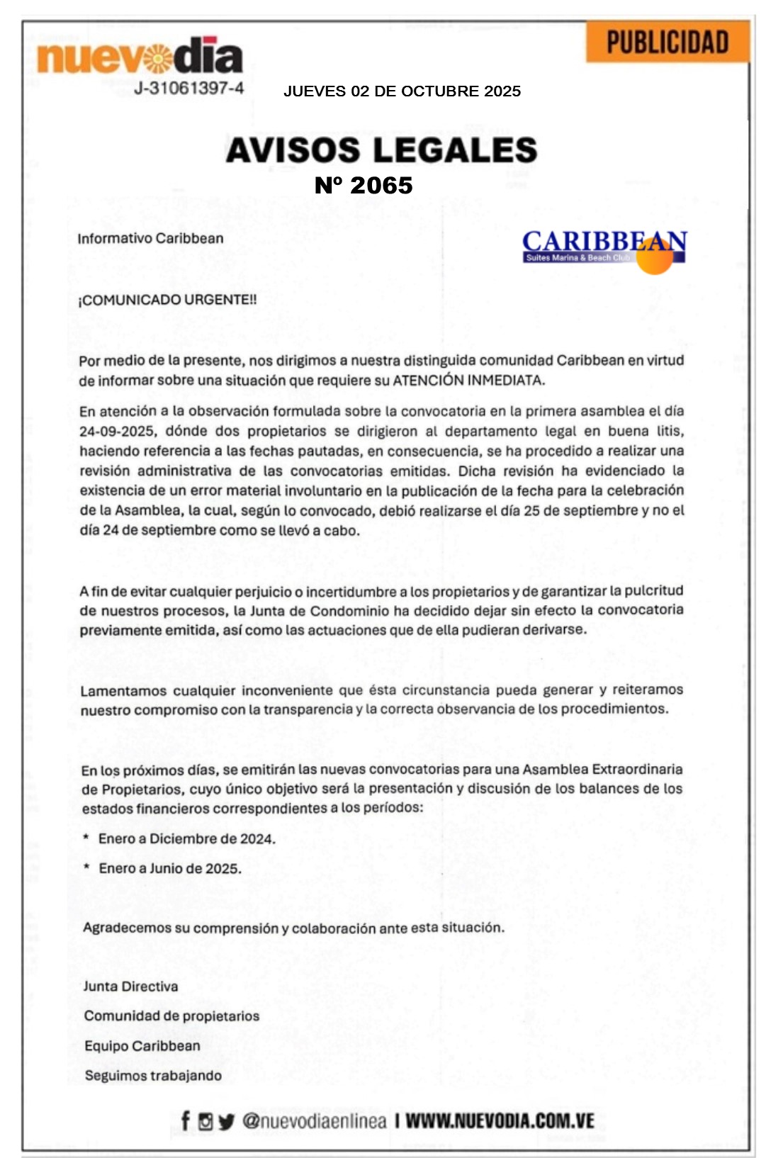 InicioPublicidadLegales PublicidadLegales Comunicado Urgente.Caribbean Suites Marina & Beach Club. 02/10/2025 FacebookTwitterPinterestWhatsApp 2065. 02-10-2025 Cuota FacebookTwitterPinterestWhatsApp Artículo anteriorPrecio del dólar BCV para hoy 2-OctArtículo siguienteSalomón Rondón anota primer gol con el Real Oviedo +VIDEO Mercadeo NuevoDia Noticias Relacionadas Legales Edicto.Virgilio José Osteicochea Martínez,Yaritza Osteicochea Petit y José Virgilio Osteicochea Petit. Legales Cartel de Citación.Ivan Javier Guillote González. Legales Cartel de Notificación.Guillermo Eduardo Stuve Rincones. Redes Sociales20,299FansMe gusta112,425SeguidoresSeguir4,600SuscriptoresSuscribirte Últimas noticias Destacadas Pronóstico del Inameh: Lluvias en varios estados este 2-Oct Destacadas Precio del dólar BCV para hoy 2-Oct Cargar más