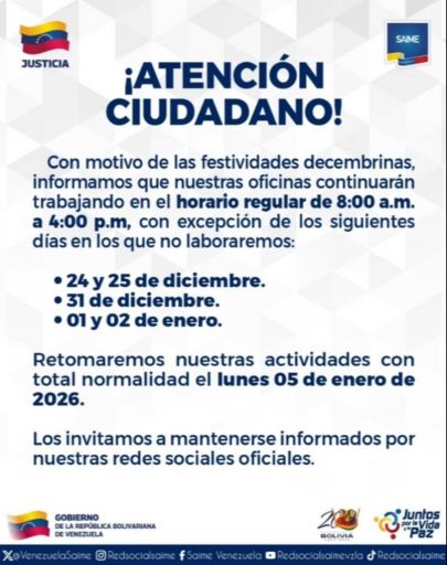 Siguiendo el calendario marcado para las festividades decembrinas, el organismo indicó que durante los días no feriados se mantendrá el horario del Saime habitual de atención al público, de 8:00 am a 4:00 pm.