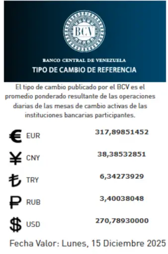 Hoy lunes 15 de diciembre, el precio del dólar oficial alcanzó un valor de 270,79 bolívares por unidad, tras registrar un incremento del 1,14 % al cierre de este viernes 12. La moneda estadounidense superó una nueva barrera de precios después de experimentar una subida del 4,99 % durante la última semana, marcada por un lunes bancario que redujo en un día las operaciones en el mercado legal de divisas.