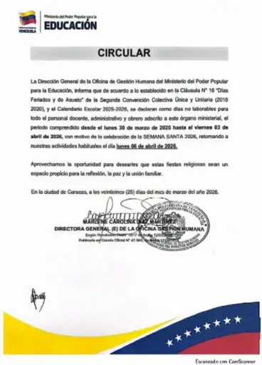 En el documento, la Dirección General de la Oficina de Gestión Humana del mencionado ministerio notificó que, conforme a lo estipulado en la Cláusula N°16 «Días Feriados y de Asueto» de la segunda Convención Colectiva Única y Unitaria (2018-2020) y al calendario escolar 2025-2026, se declaran como días no laborables para todo el personal docente, administrativo y obrero adscrito al órgano ministerial.