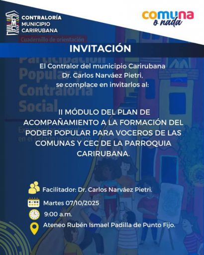 Comprometida con el fortalecimiento del Poder Popular y en cumplimiento de los lineamientos de la Contraloría General de la República Bolivariana de Venezuela, la Contraloría de Carirubana iniciará el martes 7 de octubre a la II Fase del Plan de Formación para las Comunas.