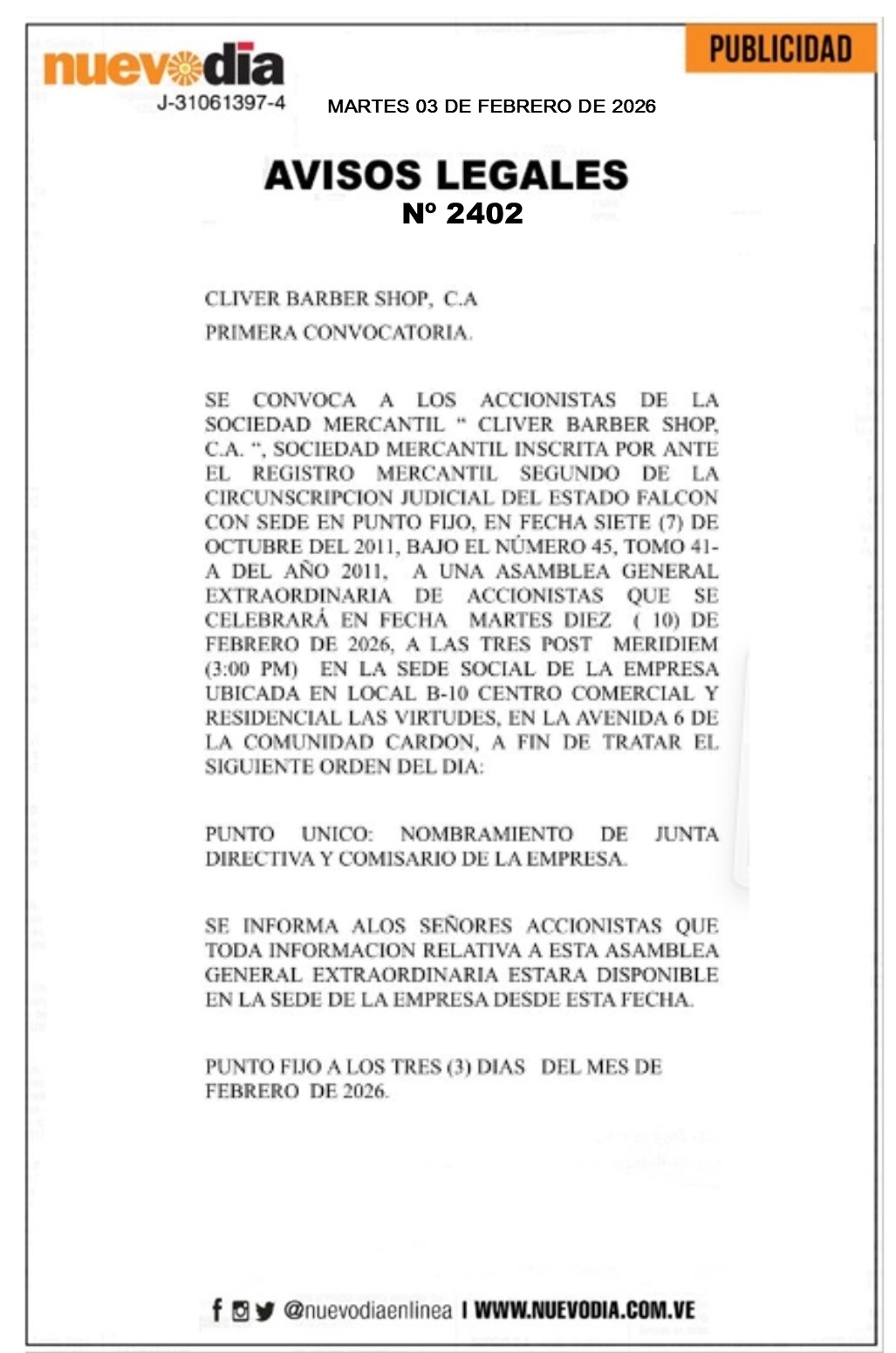 InicioPublicidadLegales PublicidadLegales Convocatoria.Accionistas de la Sociedad Mercantil «Cliver Barber Shop».C.A. 03/02/2026 FacebookTwitterPinterestWhatsApp 2402. 03-02-2026 Cuota FacebookTwitterPinterestWhatsApp Artículo anteriorEdicto.Francisco D’Sales Sandoval Rodríguez.Artículo siguienteUn adiós en dolor mayor a Guillermo De León Calles +VIDEO Mercadeo NuevoDia Noticias Relacionadas Legales Edicto.Francisco D’Sales Sandoval Rodríguez. Legales Cartel de Citación.Manuel Antonio Mesa Colina. Legales Cartel de Notificación.Hernan José Sánchez. Redes Sociales20,299FansMe gusta112,425SeguidoresSeguir4,600SuscriptoresSuscribirte Últimas noticias Destacadas Precio del dólar oficial subió 0,50 %, así se cotiza hoy 3-Feb Destacadas Delcy Rodríguez recibió en Miraflores a la encargada de negocios de EE. UU. en Venezuela Cargar más