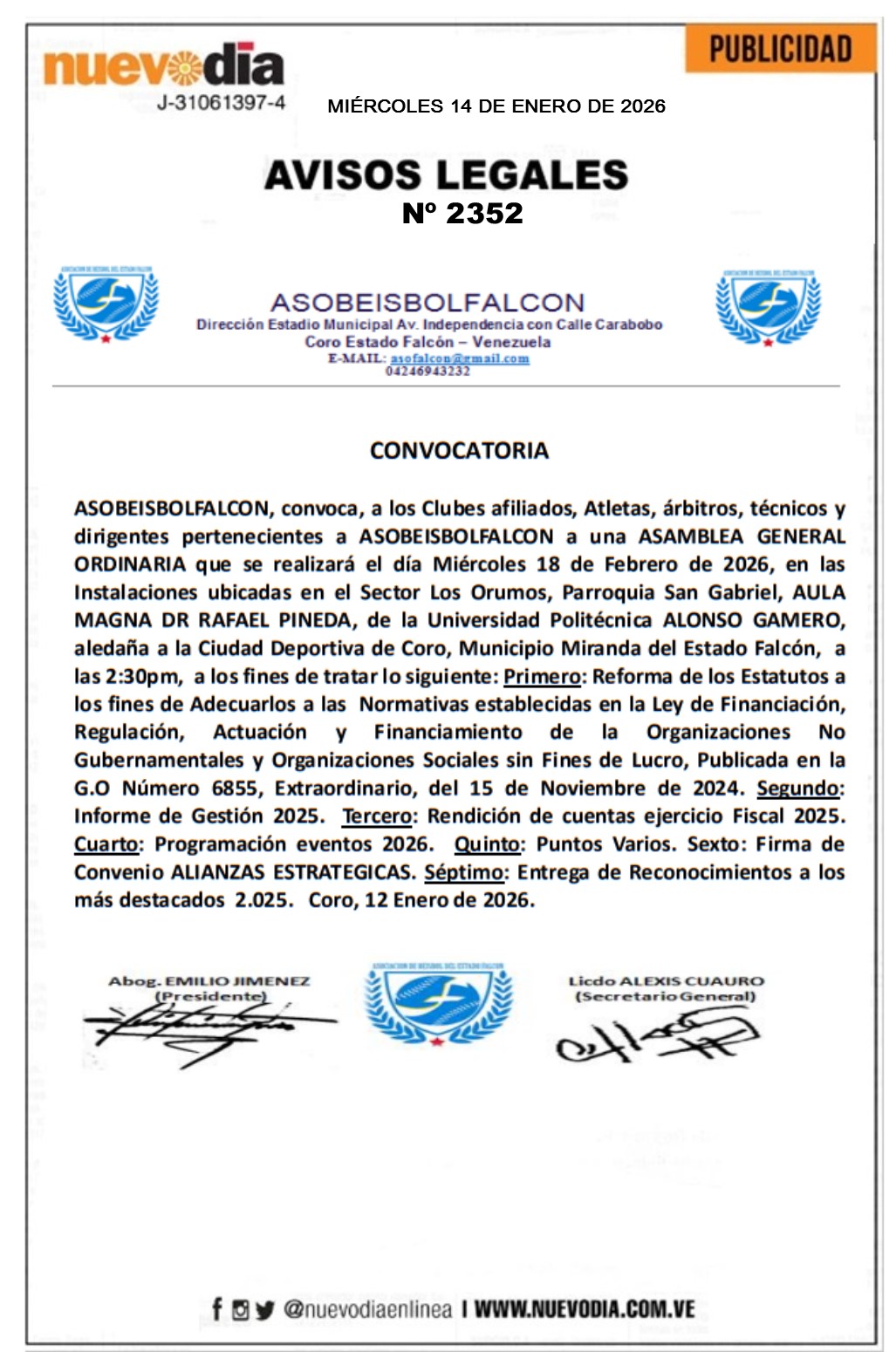 InicioPublicidadLegales PublicidadLegales Convocatoria.Asamblea General ASOBEISBOLFALCON. 14/01/2026 FacebookTwitterPinterestWhatsApp 2352. 14-01-2026 Cuota FacebookTwitterPinterestWhatsApp Artículo anteriorEdicto.Alí José Molina Rosales.Artículo siguienteGuía para ganar dinero en la Bolsa de Valores de Caracas Mercadeo NuevoDia Noticias Relacionadas Legales Edicto.Antonio José Chirino Lugo y Jorge Federico Chirinos Lugo. Legales Edicto.Alí José Molina Rosales. Legales Edicto.Luis Stefanelli Barjacoba. Redes Sociales20,299FansMe gusta112,425SeguidoresSeguir4,600SuscriptoresSuscribirte Últimas noticias Destacadas INAC | Iberia, Air Europa y Plus Ultra no reactivarán vuelos Caracas-Madrid el 1-Feb Destacadas De esto hablaron Delcy Rodríguez y Donald Trump en conversación telefónica Cargar más