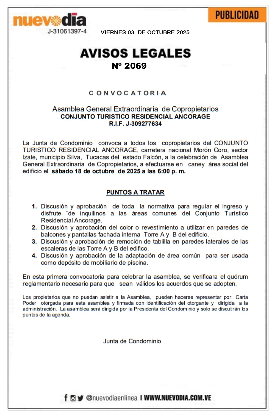 InicioPublicidadLegales PublicidadLegales Convocatoria.Asamblea General Copropietarios Conjunto Turístico Residencial Ancorage. 03/10/2025 FacebookTwitterPinterestWhatsApp 2069. 03-10-2025 Cuota FacebookTwitterPinterestWhatsApp Artículo anteriorEdicto.Esmeyro José Méndez Thompson.Artículo siguienteConoce a Trionda, el Balón del Mundial 2026 Mercadeo NuevoDia Noticias Relacionadas Legales Edicto.Esmeyro José Méndez Thompson. Legales Edicto.Elida Rosa Rodríguez de Penso. Legales Comunicado Urgente.Caribbean Suites Marina & Beach Club. Redes Sociales20,299FansMe gusta112,425SeguidoresSeguir4,600SuscriptoresSuscribirte Últimas noticias Destacadas Este es el precio del dólar para hoy 3-Oct Destacadas Falleció el exdiputado Luis Stefanelli en Caracas este 2-Oct Cargar más
