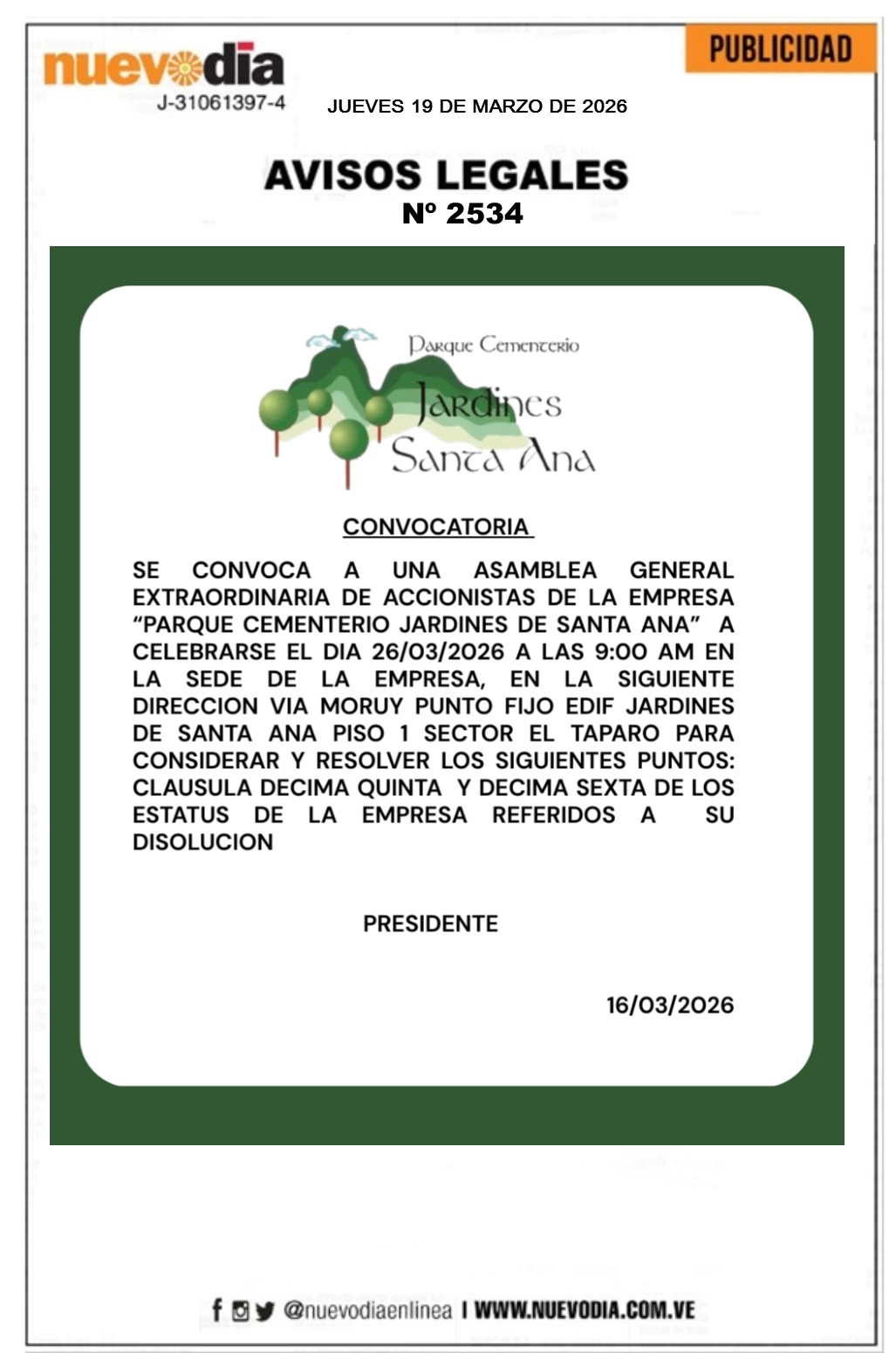 InicioPublicidadLegales PublicidadLegales Convocatoria.Asamblea General Extraordinaria de Accionistas Parque Cementerio Jardines de Santa Ana. 19/03/2026 FacebookTwitterPinterestWhatsApp 2534. 19-03-2026 Cuota FacebookTwitterPinterestWhatsApp Artículo anteriorPortada jueves 19 de marzo de 2026Artículo siguienteEdicto.Virgilio José Osteicoechea Martínez,Yaritza Osteicoechea Petit y José Virgilio Osteicoechea Petit. Mercadeo NuevoDia Noticias Relacionadas Legales Convocatoria.Asamblea Parcial.Asociados. CAPUNEFM. Legales Edicto.Virgilio José Osteicoechea Martínez,Yaritza Osteicoechea Petit y José Virgilio Osteicoechea Petit. Legales Edicto.Ricardo Antonio Sánchez. Redes Sociales20,299FansMe gusta112,425SeguidoresSeguir4,600SuscriptoresSuscribirte Últimas noticias Destacadas Gobierno nacional decreta el 17 de marzo como Día Nacional del Béisbol Destacadas Carlos Alexis Castillo es nombrado como nuevo ministro del Trabajo Cargar más