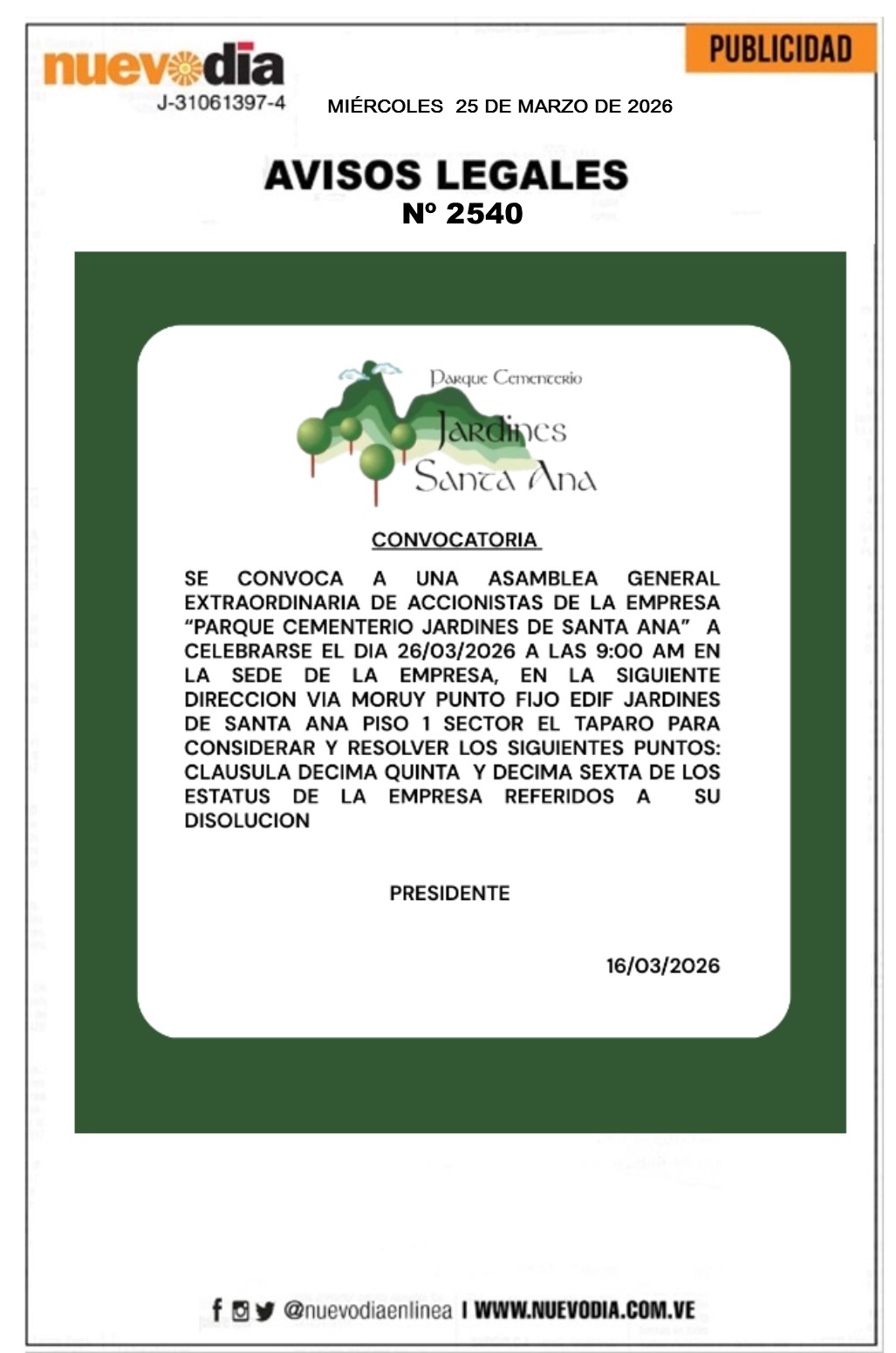 InicioPublicidadLegales PublicidadLegales Convocatoria.Asamblea General Extraordinaria de Accionistas Parque Cementerio Jardines de Santa Ana. 25/03/2026 FacebookTwitterPinterestWhatsApp 2540. 25-03-2026 Cuota FacebookTwitterPinterestWhatsApp Artículo anteriorAsí amanece el precio del dólar en Venezuela hoy 25-MarArtículo siguienteMunicipio Falcón | Comuna Unidos por Maquigua entrega 110 tanques de agua Mercadeo NuevoDia Noticias Relacionadas Legales Cartel de Notificación.José Alcides Bailon Cobeña. Legales Convocatoria.Asamblea Ordinaria de Copropietarios.Condominio Residencial Alcatraz. Legales Convocatoria.Asamblea Ordinaria.Miembros Asociación Civil Universidad de Falcón. Redes Sociales20,299FansMe gusta112,425SeguidoresSeguir4,600SuscriptoresSuscribirte Últimas noticias Destacadas Coromoto Godoy es designada como embajadora de Venezuela ante la ONU Destacadas Así amanece el precio del dólar en Venezuela hoy 25-Mar Cargar más