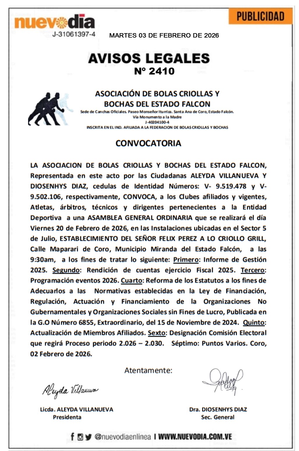 InicioPublicidadLegales PublicidadLegales Convocatoria.Clubes afiliados Asociación de Bolas Criollas y Bochas del Estado Falcón. 03/02/2026 FacebookTwitterPinterestWhatsApp 2410. 03-02-2026 Cuota FacebookTwitterPinterestWhatsApp Artículo anteriorTrump recibe a Petro en la Casa Blanca en histórica reuniónArtículo siguienteComercio entre Venezuela y Colombia crece 4,8% en 2025 Mercadeo NuevoDia Noticias Relacionadas Legales Acta Asamblea Extraordinaria.Centro Odontológico Salud Dent.C.A. Legales Edicto.Reyna Dinorah Rojas Romero. Legales Cartel de Citación.Maritza Guadalupe Lugo Flores. Redes Sociales20,299FansMe gusta112,425SeguidoresSeguir4,600SuscriptoresSuscribirte Últimas noticias Destacadas Cabello: Venezuela «registra uno de los índices de criminalidad más bajos del mundo» Destacadas Turismo venezolano proyecta una recuperación gradual en 2026 Cargar más