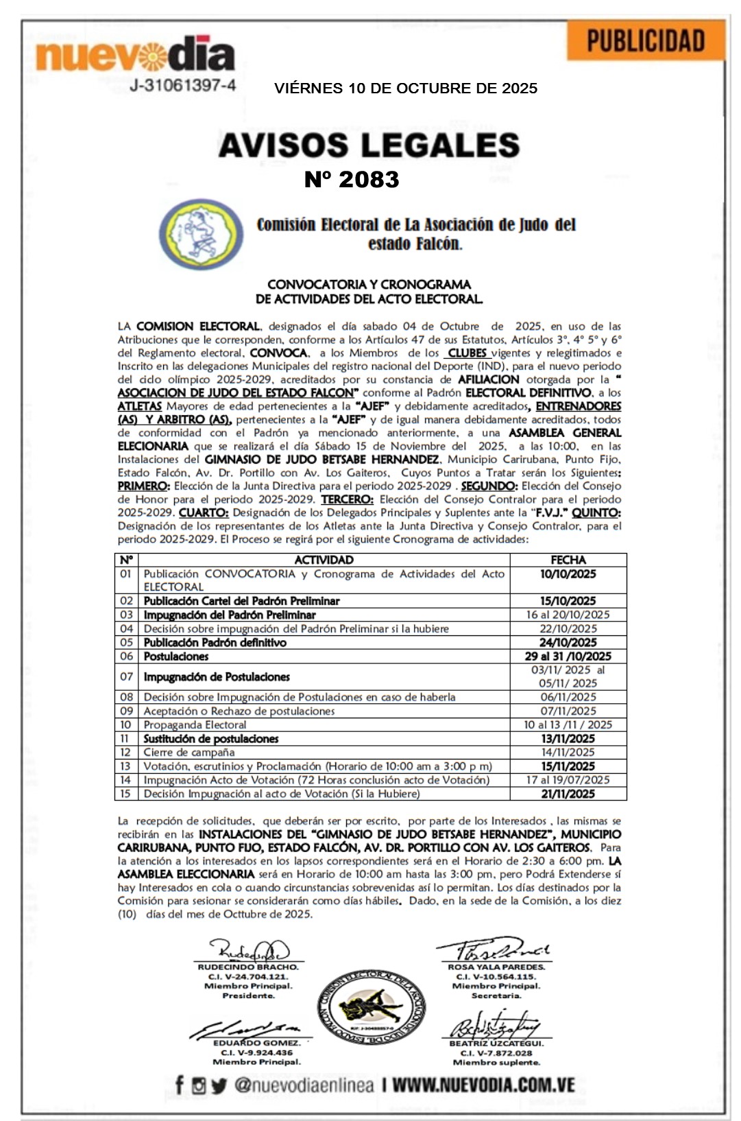 InicioPublicidadLegales PublicidadLegales Convocatoria y Cronograma Acto Electoral.Asociación de Judo del Estado Falcón. 10/10/2025 FacebookTwitterPinterestWhatsApp 2083. 10-10-2025 Cuota FacebookTwitterPinterestWhatsApp Artículo anteriorEsto dijo Dina Boluarte tras ser destituida por el Congreso de PerúArtículo siguienteDictan taller sobre sismos y desalojo en liceo de La Sierra Mercadeo NuevoDia Noticias Relacionadas Legales Convocatoria.Miembros Asociación Civil Universidad de Falcón. Legales Edicto.Yony Alberto Chirinos Alvarez. Legales Cartel de Remate.Yunes Alnardo Estanga Martínez. Redes Sociales20,299FansMe gusta112,425SeguidoresSeguir4,600SuscriptoresSuscribirte Últimas noticias Destacadas Por cambio climático lluvias en Venezuela aumentaron 300 % en 2025 Destacadas Operación Independencia 200 activa en Falcón, Zulia y Aragua +VIDEO Cargar más