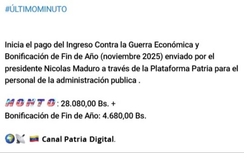 El pago del bono de hoy para los trabajadores públicos comenzó en la tarde de este viernes 14 se dio inicio al depósito del Ingreso Contra la Guerra Económica correspondiente a noviembre de 2025. Este pago, gestionado por el Ejecutivo Nacional a través de la Plataforma Patria, está destinado tanto a los empleados activos de la administración pública como a los jubilados que reciben cestatickets.