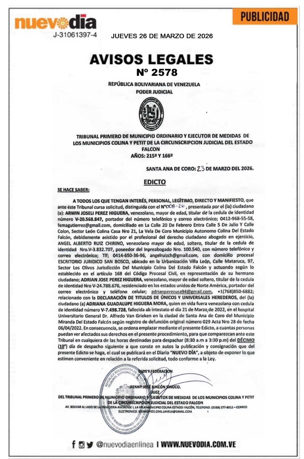 InicioPublicidadLegales PublicidadLegales Edicto.Adriana Guadalupe Higuera Mora. 26/03/2026 FacebookTwitterPinterestWhatsApp 2578. 26-03-2026 Cuota FacebookTwitterPinterestWhatsApp Artículo anteriorLuis Vicente León desestima que EE.UU. elimine las sanciones a VenezuelaArtículo siguienteProducción petrolera de Venezuela alcanzó 1,1 millones de barriles diarios en marzo Mercadeo NuevoDia Noticias Relacionadas Legales Cartel de Citación.Maricarmen Miranda Bravo. Legales Cartel de Notificación.Kenny Javier Rodríguez Aponte. Legales Cartel de Citación.Manuel Eduardo Nava Chirinos. Redes Sociales20,299FansMe gusta112,425SeguidoresSeguir4,600SuscriptoresSuscribirte Últimas noticias Destacadas Producción petrolera de Venezuela alcanzó 1,1 millones de barriles diarios en marzo Destacadas Luis Vicente León desestima que EE.UU. elimine las sanciones a Venezuela Cargar más