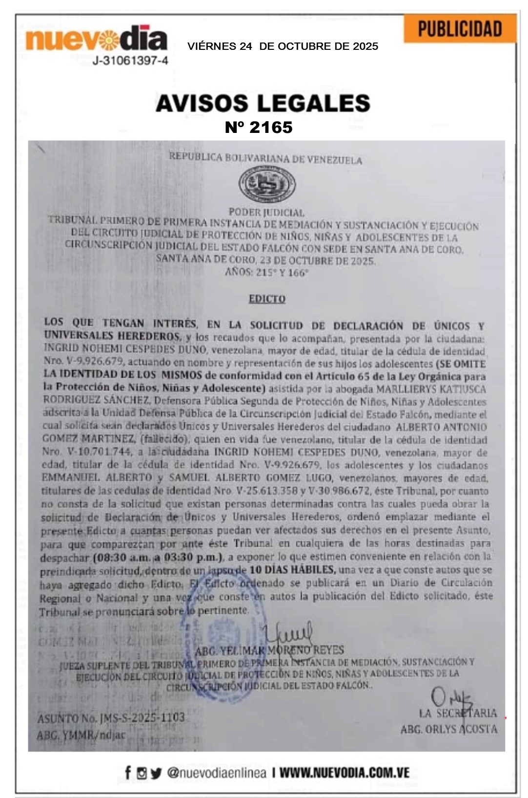 InicioPublicidadLegales PublicidadLegales Edicto.Alberto Antonio Gómez Martínez. 24/10/2025 FacebookTwitterPinterestWhatsApp 2165. 24-10-2025 Cuota FacebookTwitterPinterestWhatsApp Artículo anteriorEdicto.Alida María González de Primera.Artículo siguienteCircuito comunal Araurima entrega proyecto de la juventud Mercadeo NuevoDia Noticias Relacionadas Legales Edicto.Alida María González de Primera. Legales Aviso de Notificación:Leydi Alejandra Alvarez Cumare. Legales Cartel de Citación.Giovanny Antonio Pantaleon Baptista. Redes Sociales20,299FansMe gusta112,425SeguidoresSeguir4,600SuscriptoresSuscribirte Últimas noticias Destacadas Presidente Maduro anunció que los ejercicios militares seguirán por 72 horas más Destacadas Precio del dólar, así se cotiza este viernes 24-Oct Cargar más