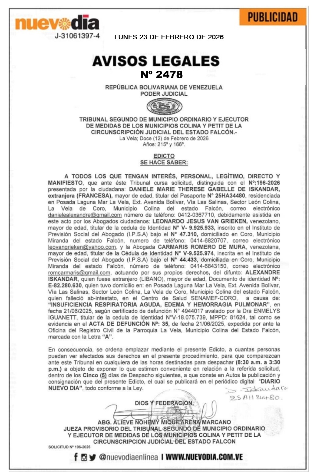 InicioPublicidadLegales PublicidadLegales Edicto.Alexandre Iskandar. 23/02/2026 FacebookTwitterPinterestWhatsApp 2478 23-02-2026 Cuota FacebookTwitterPinterestWhatsApp Artículo anteriorMás de 3 mil habitantes de Creolandia atendidos con jornada social integralArtículo siguienteEsto dijo el ministro Eduardo Piñate sobre un posible aumento de sueldo Mercadeo NuevoDia Noticias Relacionadas Legales Cartel de Notificación.Inversiones Shekina V&J.C.A. Legales Cartel de Notificación.Comercial Alpez.C.A. Legales Cartel de Notificación.Inversiones y Bodega Cotutaty.C.A. Redes Sociales20,299FansMe gusta112,425SeguidoresSeguir4,600SuscriptoresSuscribirte Últimas noticias Destacadas Inician obras para convertir el Helicoide en un espacio comunitario Destacadas Blyde: la Ley de Amnistía no es un perdón Cargar más