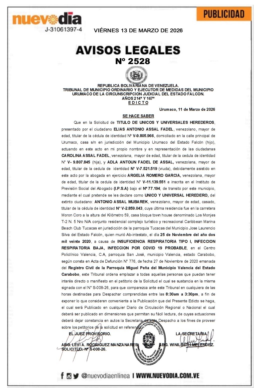 InicioPublicidadLegales PublicidadLegales Edicto.Antonio Assal Mubarek. 13/03/2026 FacebookTwitterPinterestWhatsApp 2528. 13-03-2026 Cuota FacebookTwitterPinterestWhatsApp Artículo anteriorConvocatoria.Copropietarios del Condominio del Centro Comercial y Recreacional Las Virtudes.Artículo siguienteEdicto.Francisco D’Sales Sandoval Rodríguez. Mercadeo NuevoDia Noticias Relacionadas Legales Edicto.Francisco D’Sales Sandoval Rodríguez. Legales Convocatoria.Copropietarios del Condominio del Centro Comercial y Recreacional Las Virtudes. Legales Edicto.Virgilio José Osteicoechea Martínez,Yaritza Osteicoechea Petit y José Virgilio Osteicoechea Petit. Redes Sociales20,299FansMe gusta112,425SeguidoresSeguir4,600SuscriptoresSuscribirte Últimas noticias Destacadas Sigue en aumento el precio del dólar, así se cotiza hoy 13-Mar Destacadas Cancelada reunión entre Delcy Rodríguez y Gustavo Petro +ESTO SE SABE Cargar más