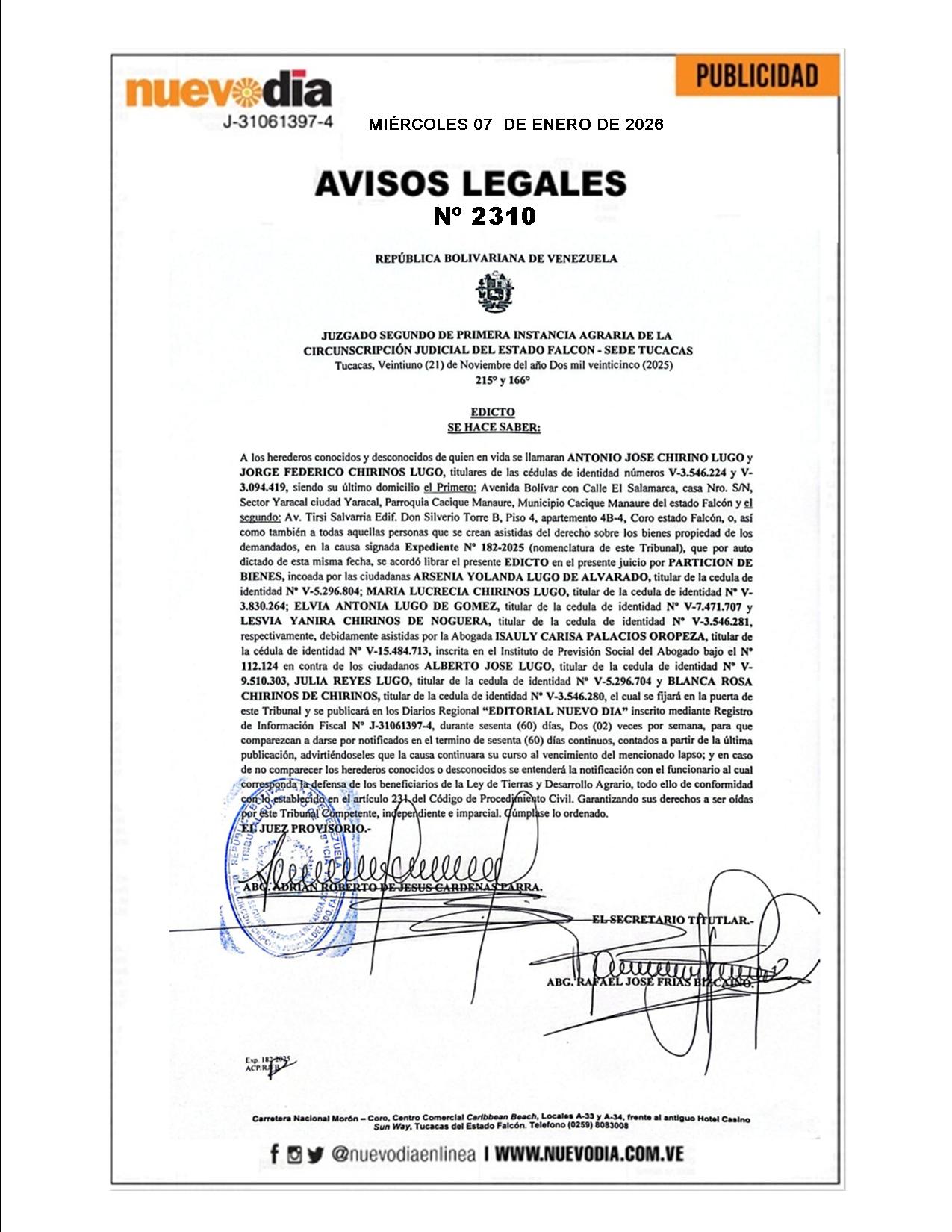 InicioPublicidadLegales PublicidadLegales Edicto.Antonio José Chirino Lugo y Jorge Federico Chirinos Lugo. 07/01/2026 FacebookTwitterPinterestWhatsApp 2310. 07-01-2026 Cuota FacebookTwitterPinterestWhatsApp Artículo anteriorClaudio Thielen y María Salazar repiten en la directiva del ClefArtículo siguienteTrump: EE.UU. recibirá hasta 50 millones de barriles de petróleo venezolano Mercadeo NuevoDia Noticias Relacionadas Legales Edicto.Rangel Salvador López Barrientos. Legales Edicto.Morella Ramírez de Lanz. Legales Aviso Público.José Manuel Sánchez Muñoz. Redes Sociales20,299FansMe gusta112,425SeguidoresSeguir4,600SuscriptoresSuscribirte Últimas noticias Destacadas EE.UU. se prepara para reabrir su embajada en Caracas Destacadas PDVSA confirma negociaciones con EE.UU. para venta de petróleo Cargar más