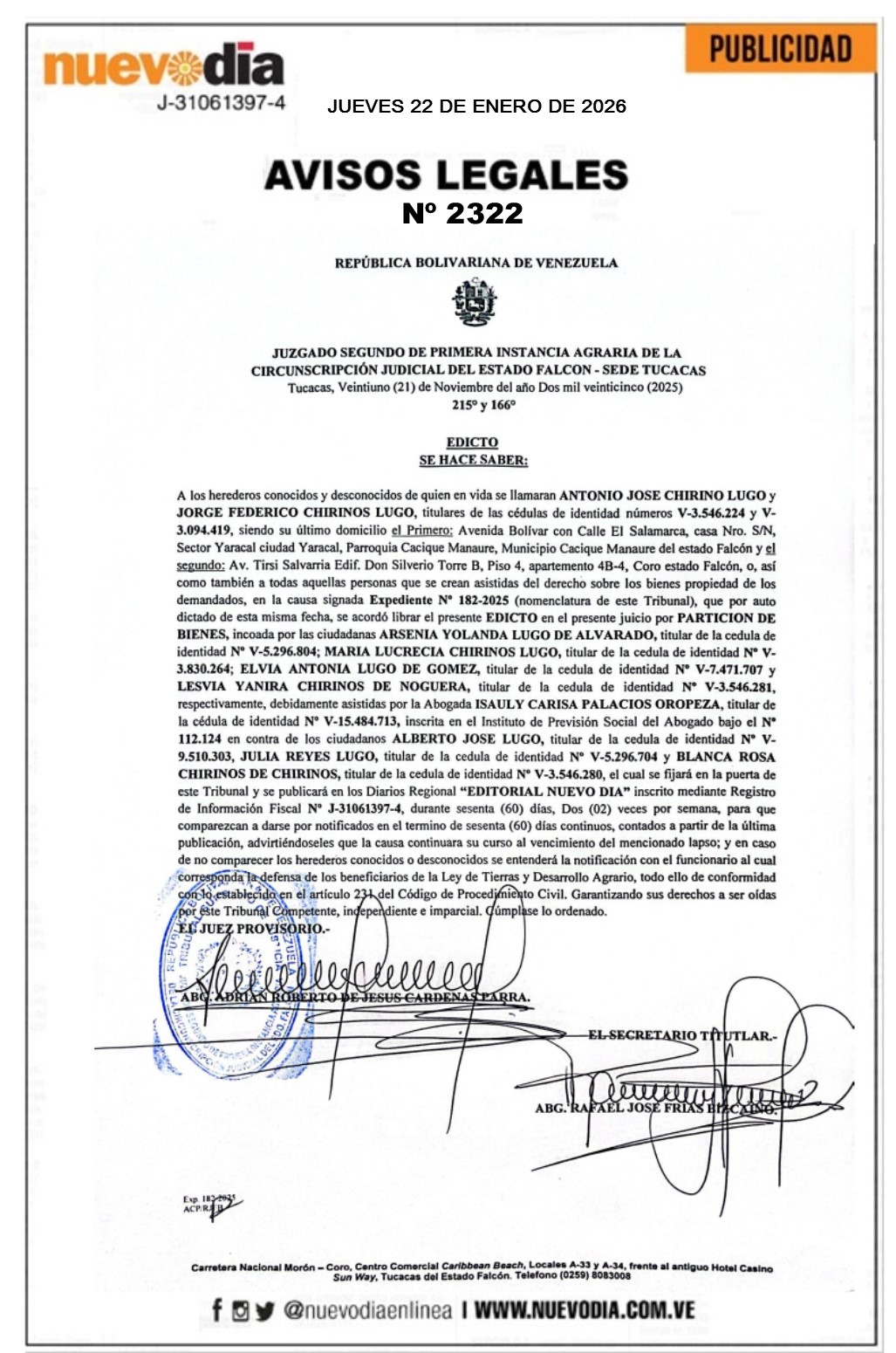 InicioPublicidadLegales PublicidadLegales Edicto.Antonio José Chirino Lugo y Jorge Federico Chirinos Lugo. 22/01/2026 FacebookTwitterPinterestWhatsApp 2322. 22-01-2026 Cuota FacebookTwitterPinterestWhatsApp Artículo anteriorPortada jueves 22 de enero de 2026Artículo siguienteExcarcelado Rafael Tudares, yerno de Edmundo González Urrutia Mercadeo NuevoDia Noticias Relacionadas Legales Edicto.Miguel Segundo Nava. Legales Edicto.Secundino Gregorio Reyes Guerrero. Legales Edicto.Gladys Guadalupe Barrios D Vargas. Redes Sociales20,299FansMe gusta112,425SeguidoresSeguir4,600SuscriptoresSuscribirte Últimas noticias Nacionales Liberado chofer de la embajada de Argentina en Caracas Destacadas Así subió el precio del dólar tras la primera subasta de divisas Cargar más