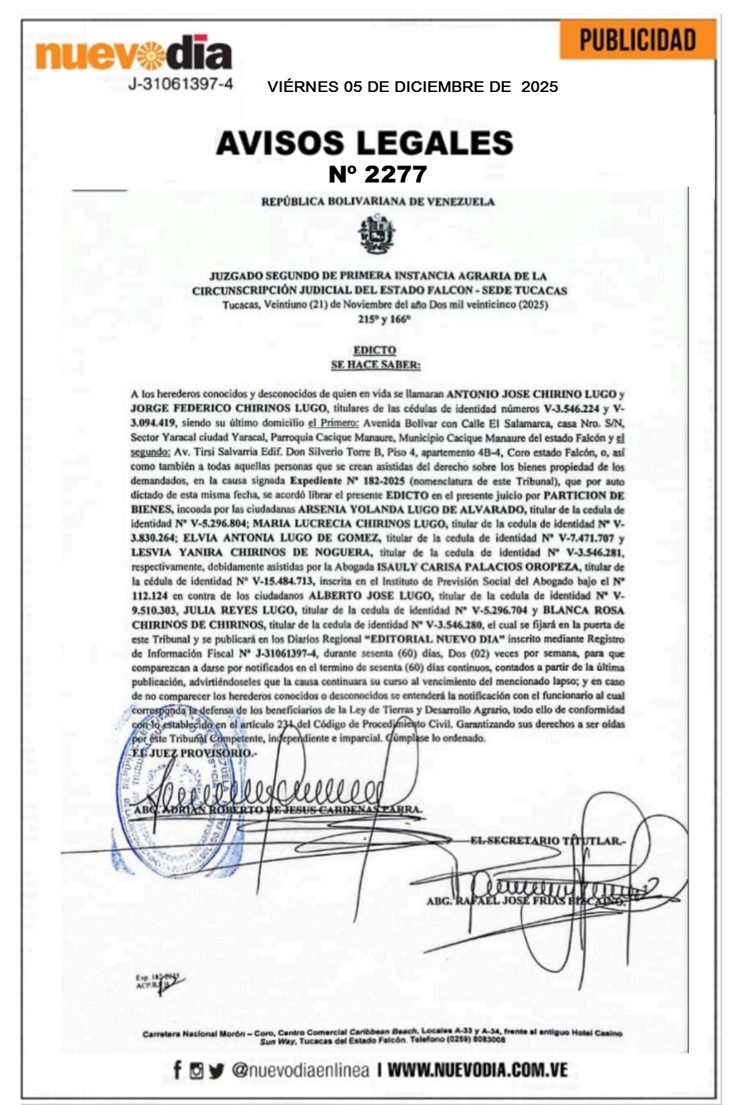 InicioSin categoria Sin categoria Edicto.Antonio José Chirino Lugo y Jorge Federico Chirinos Lugo. 05/12/2025 FacebookTwitterPinterestWhatsApp 2277. 05-12-2025 Cuota FacebookTwitterPinterestWhatsApp Artículo anteriorPortada viernes 5 de diciembre de 2025Artículo siguienteCartel de Intimación.Oneyalbert Corina González Lugo. Mercadeo NuevoDia Noticias Relacionadas Sin categoria Edicto.Anthony Molinary Martos. Sin categoria Alcaldía y el Concejo municipal reconocieron labor de músicos de Colina Sin categoria De diseñador venezolano: Elena Rose deslumbró en los Latin Grammy Redes Sociales20,299FansMe gusta112,425SeguidoresSeguir4,600SuscriptoresSuscribirte Últimas noticias Destacadas Inac espera que aerolíneas Wingo y Copa retomen vuelos en 48 horas Destacadas 48 horas | Inac espera que Wingo y Copa reanuden vuelos Cargar más