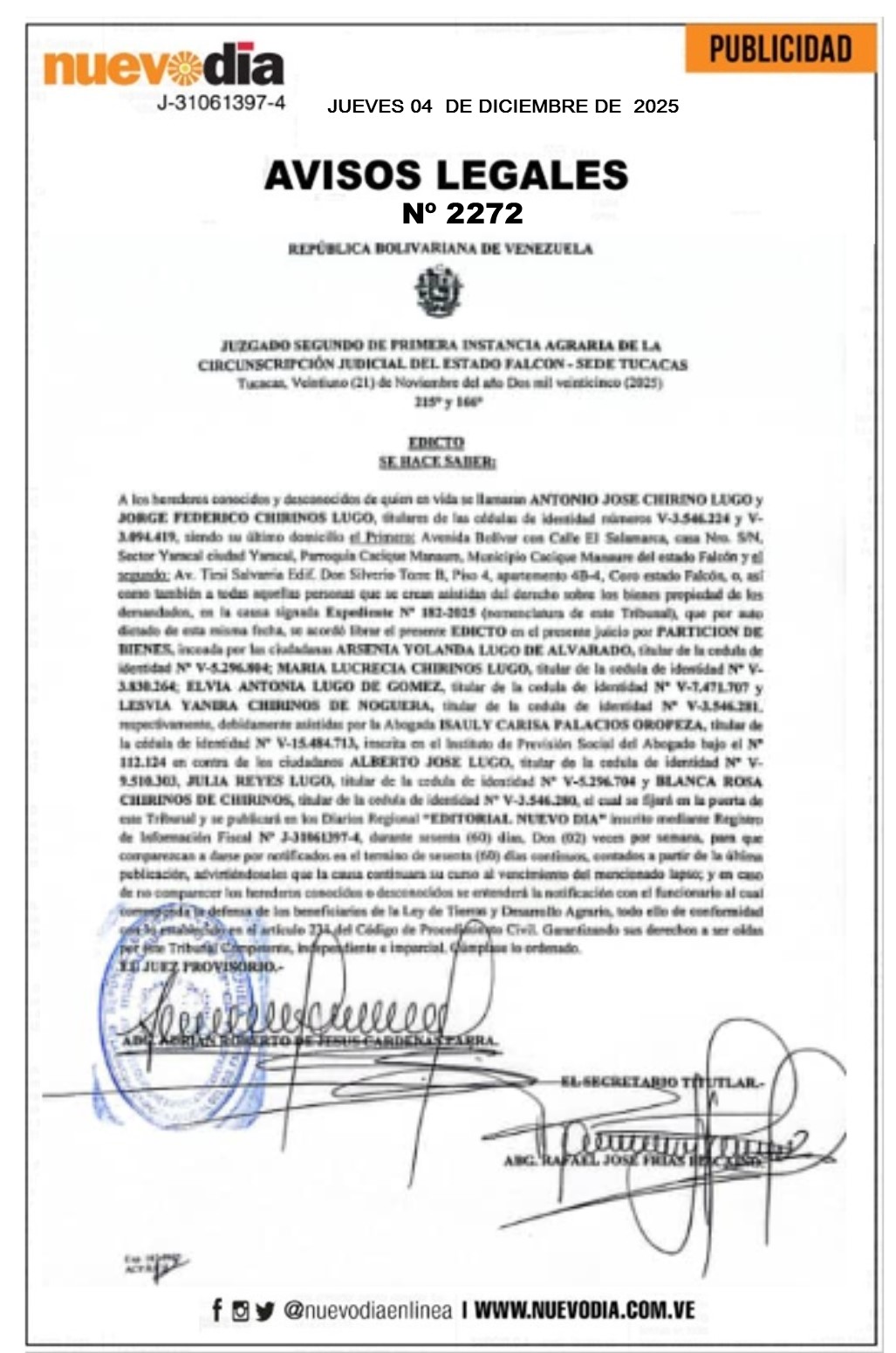 Edicto.Antonio José Chirino Lugo y Jorge Federico Chirinos Lugo.