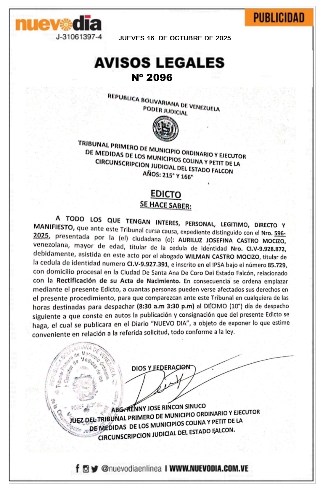 InicioPublicidadLegales PublicidadLegales Edicto.Auriluz Josefina Castro Mocizo. 16/10/2025 FacebookTwitterPinterestWhatsApp 2096. 16-10-2025 Cuota FacebookTwitterPinterestWhatsApp Artículo anteriorEdicto.Valentín José Arevalo Rosendo.Artículo siguienteEste es el precio del dólar para hoy 16-Oct Mercadeo NuevoDia Noticias Relacionadas Legales Edicto.Valentín José Arevalo Rosendo. Legales Edicto.Rafael José Saavedra Saavedra. Legales Aviso Público.Licofiestas, C.A. Redes Sociales20,299FansMe gusta112,425SeguidoresSeguir4,600SuscriptoresSuscribirte Últimas noticias Destacadas Cabello: MCM ofreció riquezas de Venezuela a cambio del Nobel de la Paz Destacadas Este es el precio del dólar para hoy 16-Oct Cargar más