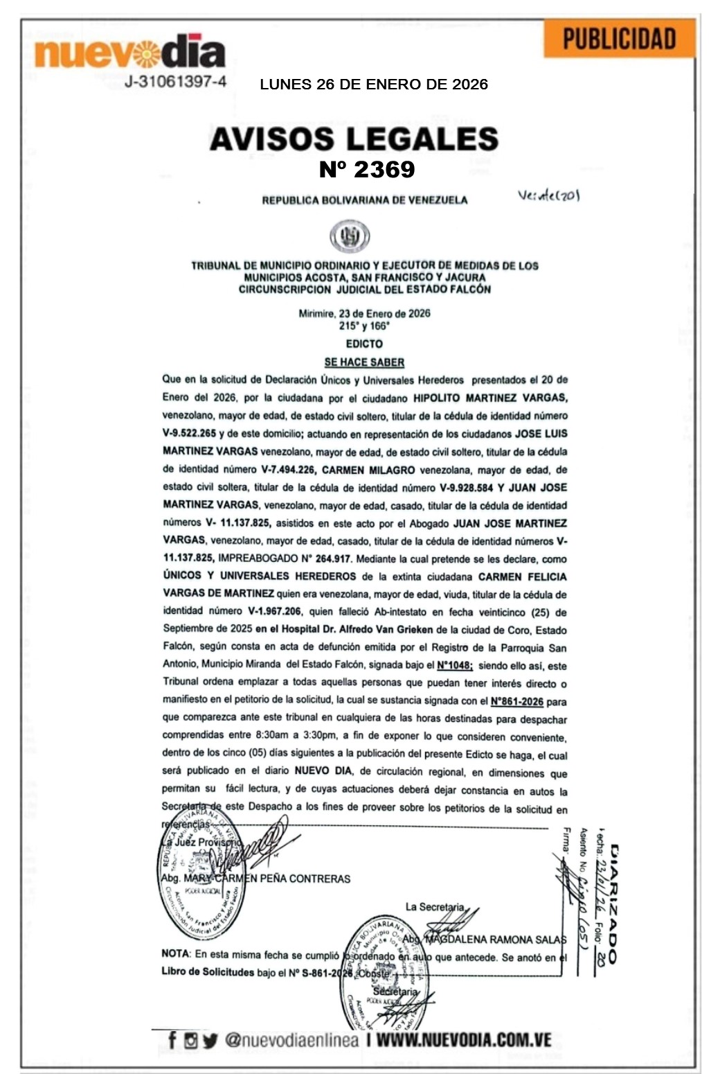 InicioPublicidadLegales PublicidadLegales Edicto.Carmen Felicia Vargas de Martínez. 26/01/2026 FacebookTwitterPinterestWhatsApp 2369. 26-01-2026 Cuota FacebookTwitterPinterestWhatsApp Artículo anteriorNuevo mensaje de Maduro a los venezolanosArtículo siguienteForo Penal reporta 266 excarcelaciones en Venezuela, cifra en aumento Mercadeo NuevoDia Noticias Relacionadas Legales Edicto.Antonio José Chirino Lugo y Jorge Federico Chirinos Lugo. Legales Cartel de Citación.Jimmy Ali Dorante Marín. Legales Cartel de Citación.Sociedad Mercantil Axalca Express.C.A. (Mirla Arrage de Corvaia). Redes Sociales20,299FansMe gusta112,425SeguidoresSeguir4,600SuscriptoresSuscribirte Últimas noticias Destacadas Foro Penal reporta 266 excarcelaciones en Venezuela, cifra en aumento Destacadas Nuevo mensaje de Maduro a los venezolanos Cargar más
