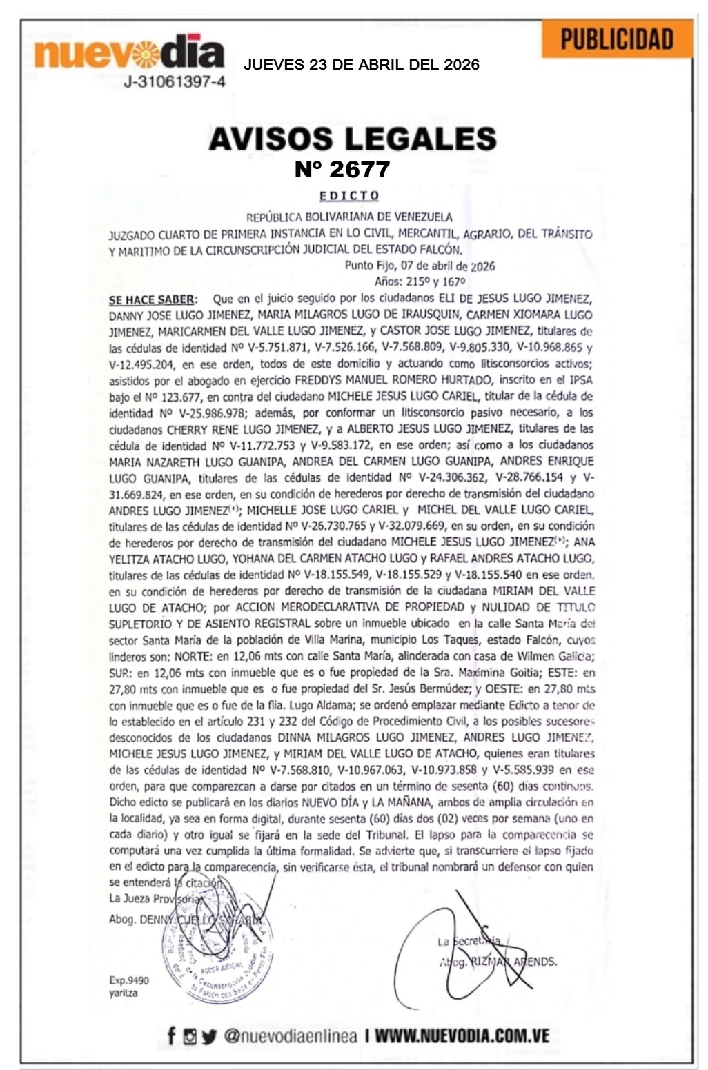 InicioPublicidadLegales PublicidadLegales Edicto.Dinna Milagros Lugo Jiménez, Andrés Lugo Jiménez, Michele Jesús Lugo Jiménez y Miriam del Valle Lugo de Atacho. 23/04/2026 FacebookTwitterPinterestWhatsApp 2677. 23-04-226 Cuota FacebookTwitterPinterestWhatsApp Artículo anteriorCartel de Citación.Ana Margarita Gómez Bermúdez.Artículo siguienteAsí abre el precio del dólar este 23-Abr Mercadeo NuevoDia Noticias Relacionadas Legales Cartel de Citación.Ana Margarita Gómez Bermúdez. Legales Edicto.Osmel José Mora Blanco. Legales Convocatoria.Asamblea Extraordinaria.Copropietarios del Conjunto Residencial Isla Mar Suites. Redes Sociales20,299FansMe gusta112,425SeguidoresSeguir4,600SuscriptoresSuscribirte Últimas noticias Destacadas Así abre el precio del dólar este 23-Abr Destacadas Jorge Arreaza: 8.616 personas han sido beneficiadas con la Ley de Amnistía Cargar más