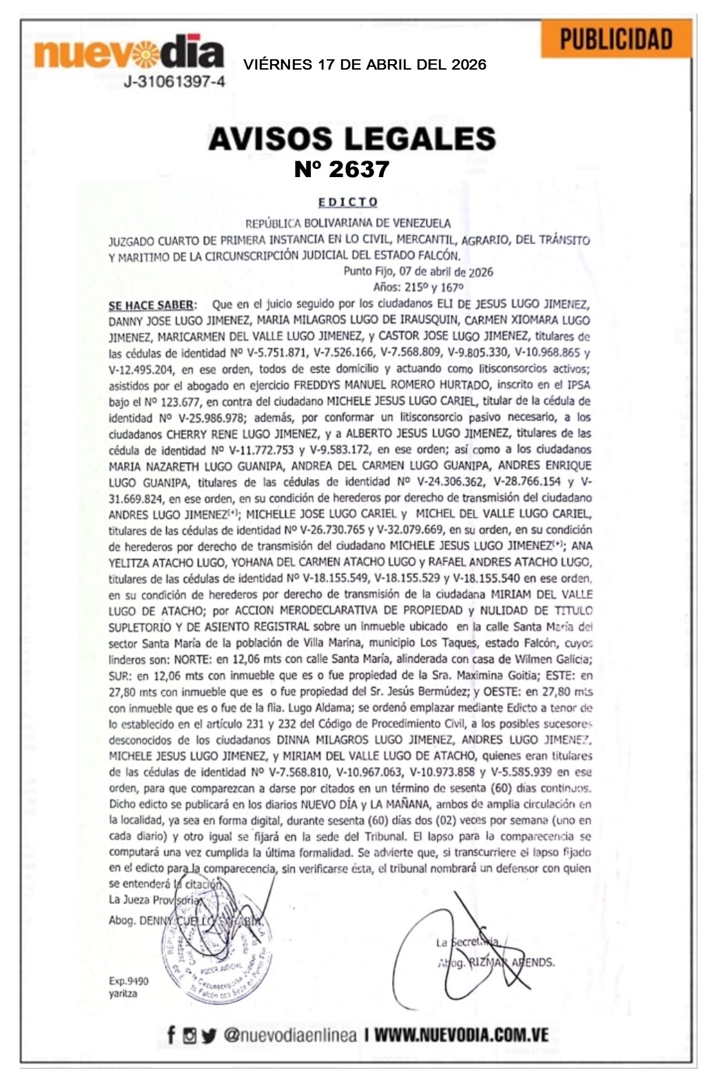 InicioPublicidadLegales PublicidadLegales Edicto.Dinna Milagros Lugo Jiménez, Andrés Lugo Jiménez, Michele Jesús Lugo Jiménez y Miriam del Valle Lugo de Atacho. 17/04/2026 FacebookTwitterPinterestWhatsApp 2637. 17-04-026 Cuota FacebookTwitterPinterestWhatsApp Artículo anteriorAvanza rehabilitación integral del núcleo Los Perozo de la Unefm Mercadeo NuevoDia Noticias Relacionadas Legales Notificación.Orlando Anibal Alvarez Arias. Legales Edicto.Nerys Julian Piña. Legales Convocatoria.Accionistas A y B.Asamblea Ordinaria de Socios.Clínica Virgen de Guadalupe. Redes Sociales20,299FansMe gusta112,425SeguidoresSeguir4,600SuscriptoresSuscribirte Últimas noticias Destacadas Así abre el precio del dólar hoy 17-Abr Destacadas Jorge Rodríguez y delegación de la UE acuerdan agenda de desarrollo productivo Cargar más