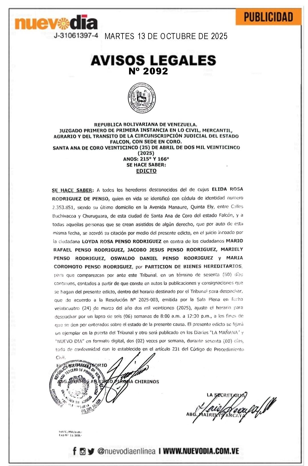 InicioPublicidadLegales PublicidadLegales Edicto.Elida Rosa Rodríguez de Penso. 13/10/2025 FacebookTwitterPinterestWhatsApp 2092. 13-10-2025 Cuota FacebookTwitterPinterestWhatsApp Artículo anteriorZelenski confía en que Trump interceda por la paz en UcraniaArtículo siguienteSujeto descuartizó y quemó a su pareja, es su segundo femicidio Mercadeo NuevoDia Noticias Relacionadas Legales Edicto.Domingo García Ruíz. Legales Edicto.Rosa Margarita Sánchez de Jiménez. Legales Segunda Convocatoria.Propietarios del Condominio Complejo Caribbean Marina & Beach Club. Redes Sociales20,299FansMe gusta112,425SeguidoresSeguir4,600SuscriptoresSuscribirte Últimas noticias Destacadas Venezuela aumenta producción petrolera a 1.105.000 bpd en septiembre Destacadas Vaticano devela imagen de JGH y madre Carmen previo a la canonización (FOTOS) Cargar más