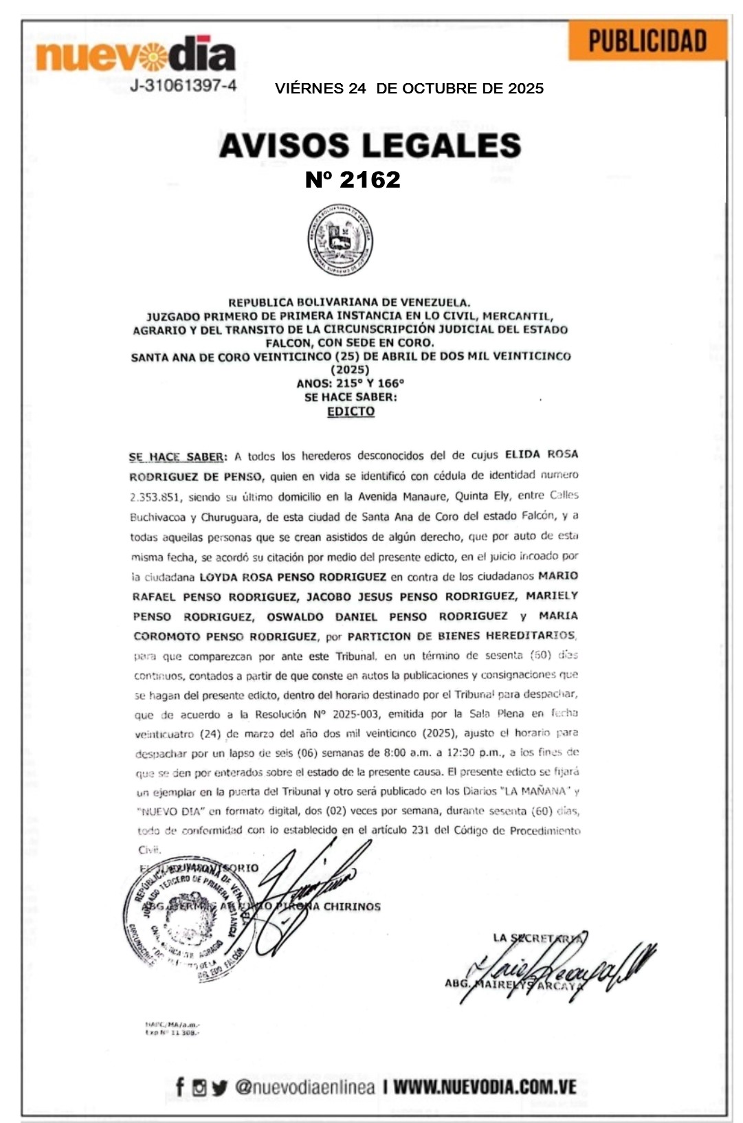 InicioPublicidadLegales PublicidadLegales Edicto.Elida Rosa Rodríguez de Penso. 24/10/2025 FacebookTwitterPinterestWhatsApp 2162. 24-10-2025 Cuota FacebookTwitterPinterestWhatsApp Artículo anteriorEdicto.Flora Beatriz Loyo de Toyo, José Angel Toyo Acosta, José Antonio Toyo Loyo, Jésus Israel Toyo Loyo, Yoel Rafael Toyo Loyo, Henry Gregorio Toyo Loyo e Ivan Jesús Toyo Loyo.Artículo siguienteCartel de Citación.Giovanny Antonio Pantaleon Baptista. Mercadeo NuevoDia Noticias Relacionadas Legales Cartel de Citación.Giovanny Antonio Pantaleon Baptista. Legales Edicto.Flora Beatriz Loyo de Toyo, José Angel Toyo Acosta, José Antonio Toyo Loyo, Jésus Israel Toyo Loyo, Yoel Rafael Toyo Loyo, Henry Gregorio Toyo... Legales Cartel de Notificación.Automercado Virgen del Carmen, C.A. Redes Sociales20,299FansMe gusta112,425SeguidoresSeguir4,600SuscriptoresSuscribirte Últimas noticias Destacadas Presidente Maduro anunció que los ejercicios militares seguirán por 72 horas más Destacadas Precio del dólar, así se cotiza este viernes 24-Oct Cargar más