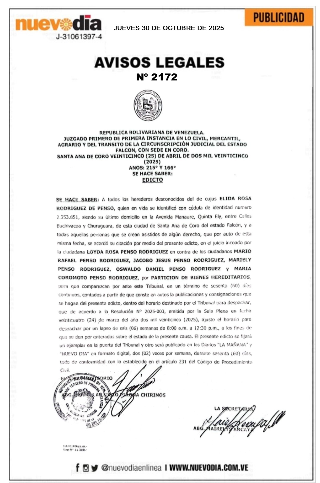 InicioPublicidadLegales PublicidadLegales Edicto.Elida Rosa Rodríguez de Penso. 30/10/2025 FacebookTwitterPinterestWhatsApp 2172. 30-10-2025 Cuota FacebookTwitterPinterestWhatsApp Artículo anteriorHoy 30-Oct este es el precio del dólar en VenezuelaArtículo siguienteLluvias en Venezuela | Así está el pronóstico del tiempo este 30-Oct Mercadeo NuevoDia Noticias Relacionadas Legales Cartel de Notificación.Morillo Autoparts,C.A. Legales Cartel de Notificación.Hotel Turístico Las Turas, C.A. Legales Cartel de Notificación.Hotel Turístico Las Turas, C.A. Redes Sociales20,299FansMe gusta112,425SeguidoresSeguir4,600SuscriptoresSuscribirte Últimas noticias Destacadas Dos aviones del narcotráfico interceptó la FANB Destacadas Lluvias en Venezuela | Así está el pronóstico del tiempo este 30-Oct Cargar más