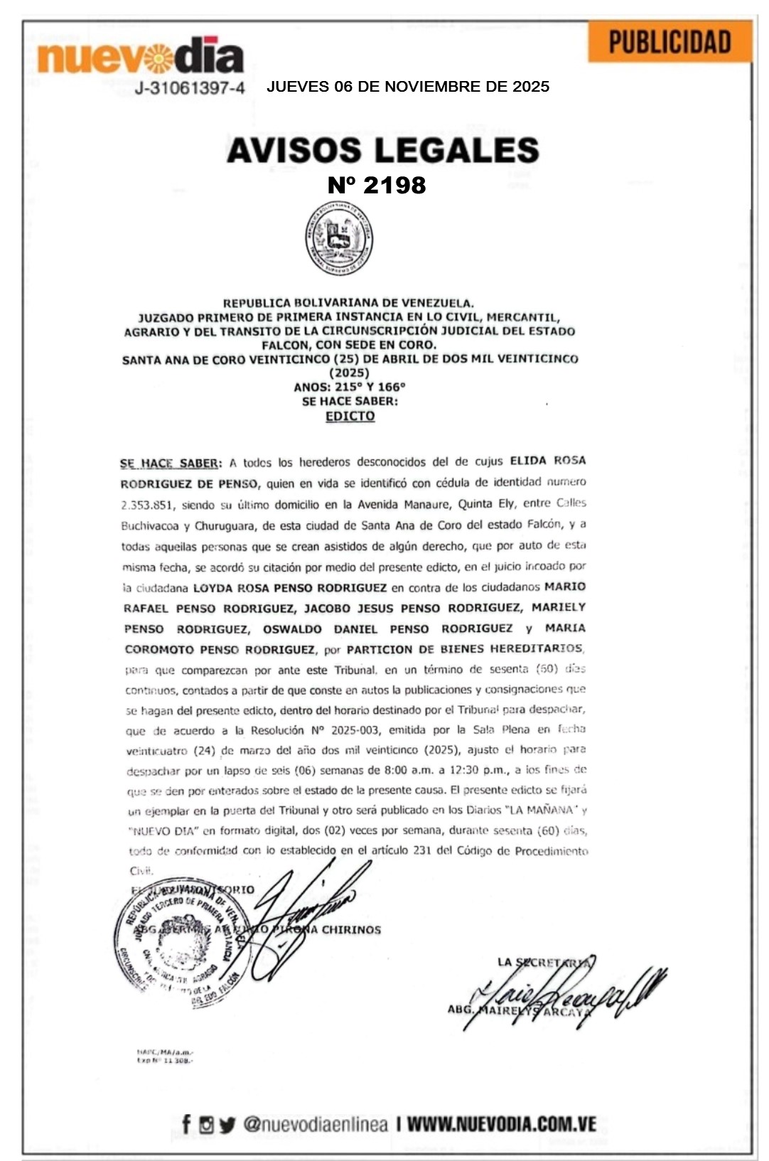 InicioPublicidadLegales PublicidadLegales Edicto.Elida Rosa Rodríguez de Penso. 06/11/2025 FacebookTwitterPinterestWhatsApp 2198. 06-11-2025 Cuota FacebookTwitterPinterestWhatsApp Artículo anteriorPequeños Mirandinos da respuestas a niños y niñas en Libertadores de AméricaArtículo siguienteSipef captura a dos personas por abuso sexual a adolescente en Coro Mercadeo NuevoDia Noticias Relacionadas Legales Cartel de Notificación.Efrain José Fernández Lugo. Legales Edicto.Lucia Caradonna de Maggi. Legales Cartel de Notificación.Comercializadora Damasco,C.A. Redes Sociales20,299FansMe gusta112,425SeguidoresSeguir4,600SuscriptoresSuscribirte Últimas noticias Destacadas Cabello: Extrema derecha planea nueva «Operación Gedeón» entre el 9 y 12-Nov Destacadas 6- Nov | Hoy el precio del dólar es este Cargar más