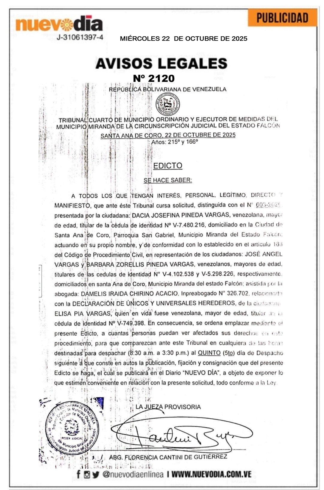 InicioPublicidadLegales PublicidadLegales Edicto.Elisa Pia Vargas. 22/10/2025 FacebookTwitterPinterestWhatsApp 2120. 22-10-2025 Cuota FacebookTwitterPinterestWhatsApp Artículo anteriorLouvre reabre sus puertas tres días después del robo del sigloArtículo siguienteDos muertos deja aparatoso accidente de avioneta en San Cristóbal Mercadeo NuevoDia Noticias Relacionadas Legales Edicto.José Luís Hidalgo. Legales Edicto.Rosendo Antonio Antequera Peña. Legales Edicto.José Vicente Pérez Borjas. Redes Sociales20,299FansMe gusta112,425SeguidoresSeguir4,600SuscriptoresSuscribirte Últimas noticias Destacadas Inameh pronostica lluvias en siete regiones del país para este 22-Oct Destacadas Venezuela: informe de expertos de la ONU advierten acción de EE.UU. Cargar más