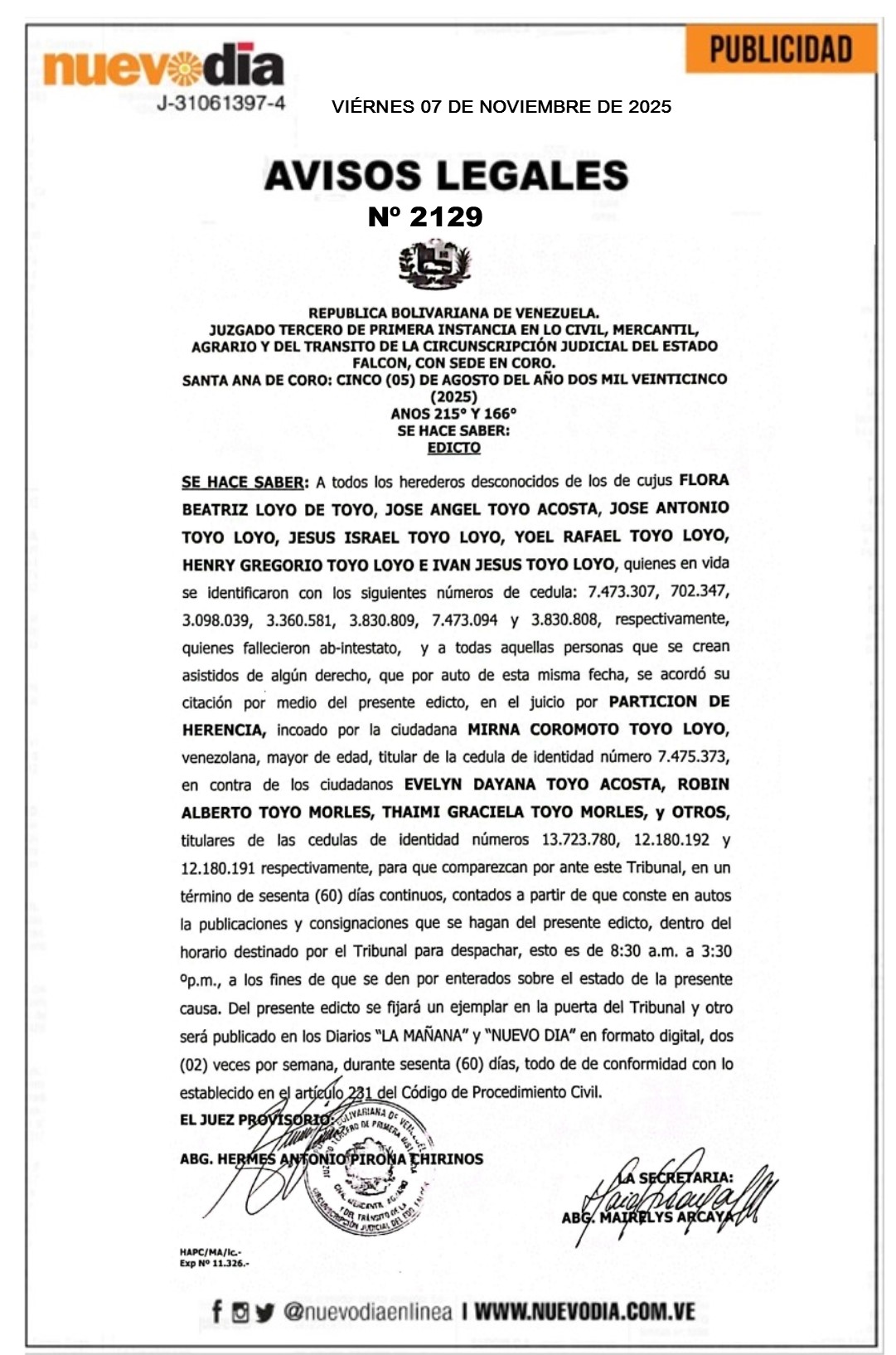 InicioPublicidadLegales PublicidadLegales Edicto.Flora Beatriz Loyo de Toyo, José Angel Toyo Acosta, José Antonio Toyo Loyo, Jésus Israel Toyo Loyo, Yoel Rafael Toyo Loyo, Henry Gregorio Toyo Loyo e Ivan Jesús Toyo Loyo. 07/11/2025 FacebookTwitterPinterestWhatsApp 2129. 07-11-2025 Cuota FacebookTwitterPinterestWhatsApp Artículo anteriorPortada viernes 7 de noviembre de 2025Artículo siguienteAsí está el precio del dólar en Venezuela hoy 7-Nov Mercadeo NuevoDia Noticias Relacionadas Legales Edicto.Elida Rosa Rodríguez de Penso. Legales Cartel de Notificación.Efrain José Fernández Lugo. Legales Edicto.Lucia Caradonna de Maggi. Redes Sociales20,299FansMe gusta112,425SeguidoresSeguir4,600SuscriptoresSuscribirte Últimas noticias Destacadas Así está el precio del dólar en Venezuela hoy 7-Nov Destacadas Venezuela participa en la COP30 de Brasil (+FOTOS) Cargar más