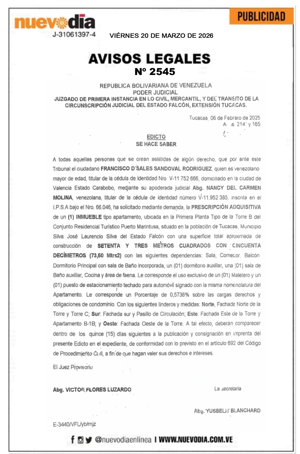 InicioPublicidadLegales PublicidadLegales Edicto.Francisco D’Sales Sandoval Rodríguez. 20/03/2026 FacebookTwitterPinterestWhatsApp 2545. 20-03-2026 Cuota FacebookTwitterPinterestWhatsApp Artículo anteriorConvocatoria.Asamblea General Extraordinaria de Accionistas.Parque Cementerio Jardines de Santa Ana.Artículo siguienteConvocatoria.Asamblea Ordinaria a miembros de la Asociación Civil Centro Cívico Cardón. Mercadeo NuevoDia Noticias Relacionadas Legales Convocatoria.Asamblea Ordinaria a miembros de la Asociación Civil Centro Cívico Cardón. Legales Convocatoria.Asamblea General Extraordinaria de Accionistas.Parque Cementerio Jardines de Santa Ana. Legales Convocatoria.Asamblea Parcial.Asociados. CAPUNEFM. Redes Sociales20,299FansMe gusta112,425SeguidoresSeguir4,600SuscriptoresSuscribirte Últimas noticias Destacadas Presidenta encargada recibió a la delegación del Senado de EE.UU. en Miraflores Destacadas Nuevo alto mando militar de Venezuela fue juramentado Cargar más