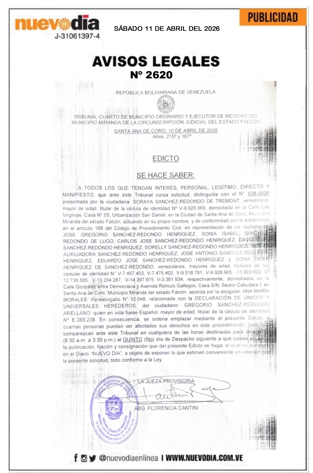 InicioPublicidadLegales PublicidadLegales Edicto.Gregorio Sánchez Redondo Arellano. 11/04/2026 FacebookTwitterPinterestWhatsApp 2620. 11-04-2026 Cuota FacebookTwitterPinterestWhatsApp Artículo anteriorCartel de Citación.Gustavo Adolfo Navas Mendoza.Artículo siguienteAlcalde de Colina supervisó inmuebles que serán intervenidos en La Vela Mercadeo NuevoDia Noticias Relacionadas Legales Cartel de Citación.Gustavo Adolfo Navas Mendoza. Legales Edicto.Marba Nahairobis Roque Gotopo. Legales Acta de Asamblea Extraodinaria.Mundo Motor’s 2024.C.A. Redes Sociales20,299FansMe gusta112,425SeguidoresSeguir4,600SuscriptoresSuscribirte Últimas noticias Destacadas Maestros entregan propuestas para recuperar ingreso económico al ministro Rodríguez Destacadas Así quedaron las tarifas de los peajes tras nuevo aumento Cargar más