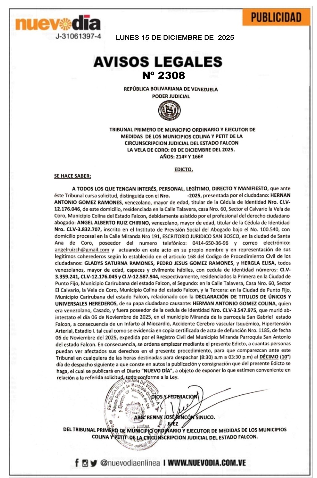 InicioPublicidadLegales PublicidadLegales Edicto.Herman Antonio Gómez Colina. 15/12/2025 FacebookTwitterPinterestWhatsApp 2308. 15-12-2025 Cuota FacebookTwitterPinterestWhatsApp Artículo anteriorEste 16-Dic inician las misas de aguinaldo en VenezuelaArtículo siguienteLeón XIV insta a acabar con la violencia antisemita tras ataque en Sídney Mercadeo NuevoDia Noticias Relacionadas Legales Edicto.Antonio José Chirino Lugo y Jorge Federico Chirinos Lugo. Legales Edicto.María Antonio Granadillo de Pulgar. Legales Cartel de Intimación.Oneyarlbert Corina González Lugo. Redes Sociales20,299FansMe gusta112,425SeguidoresSeguir4,600SuscriptoresSuscribirte Últimas noticias Destacadas Este 16-Dic inician las misas de aguinaldo en Venezuela Destacadas PDVSA denuncia ciberataque y asegura continuidad operativa Cargar más
