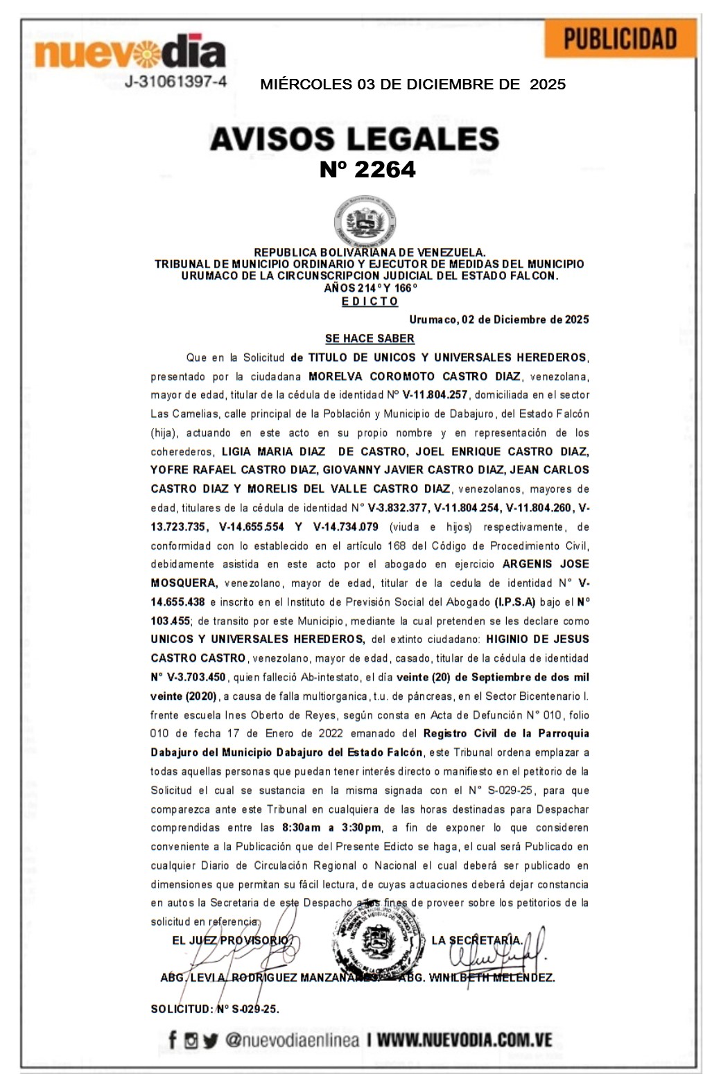InicioPublicidadLegales PublicidadLegales Edicto.Higinio de Jesús Castro Castro. 03/12/2025 FacebookTwitterPinterestWhatsApp 2264. 03-12-2025 Cuota FacebookTwitterPinterestWhatsApp Artículo anteriorPortada del 3 de diciembre de 2025Artículo siguienteAN repudia despojo de Citgo por parte de EE. UU. Mercadeo NuevoDia Noticias Relacionadas Legales Convocatoria.Asamblea Extraordinaria de Accionistas.Serenos Montalban.C.A. Legales Edicto.Elida Rosa Rodríguez de Penso. Legales Edicto.Oswaldo Alberto Pulgar García. Redes Sociales20,299FansMe gusta112,425SeguidoresSeguir4,600SuscriptoresSuscribirte Últimas noticias Destacadas AN repudia despojo de Citgo por parte de EE. UU. Destacadas Este es el precio del dólar hoy 3-Dic Cargar más