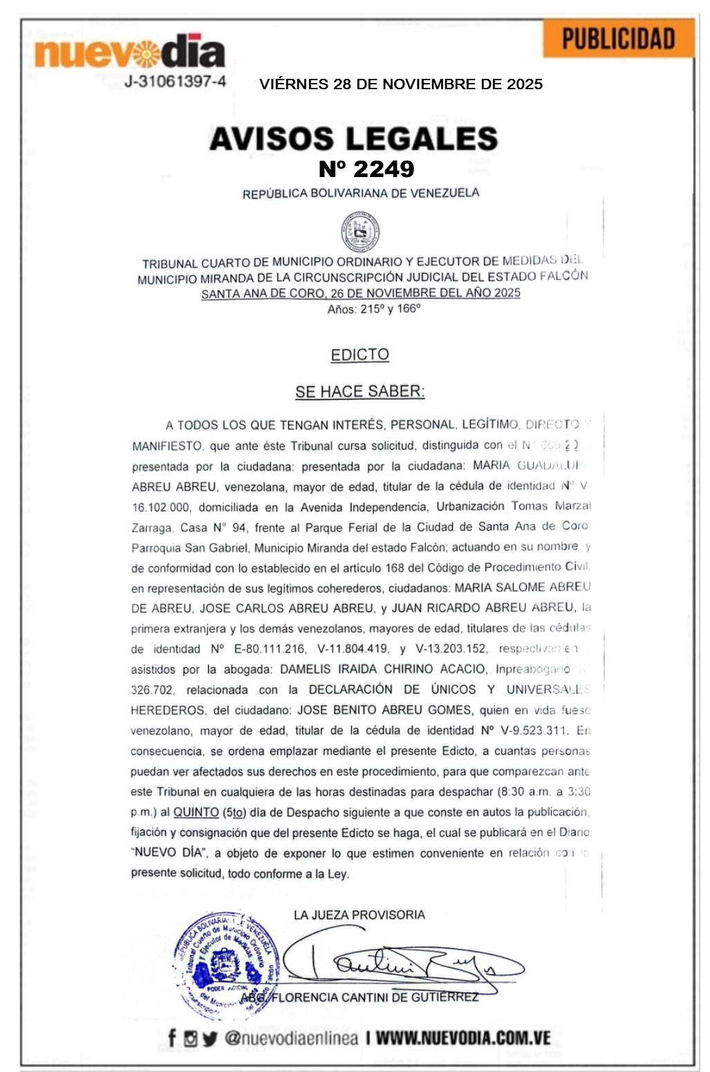 InicioPublicidadLegales PublicidadLegales Edicto.José Benito Abreu Gomes. 28/11/2025 FacebookTwitterPinterestWhatsApp 2249. 28-11-2025 Cuota FacebookTwitterPinterestWhatsApp Artículo anteriorVenezuela busca abrir nuevas rutas aéreas con RusiaArtículo siguienteCombates entre ELN y disidencias de las Farc dejan siete muertos Mercadeo NuevoDia Noticias Relacionadas Legales Edicto.María Antonia Granadillo de Pulgar. Legales Edicto.Flora Beatriz Loyo de Toyo, José Angel Toyo Acosta, José Antonio Toyo Loyo, Jésus Israel Toyo Loyo, Yoel Rafael Toyo Loyo, Henry Gregorio Toyo... Legales Cartel de Notificación.Yovanny Omar Polo Vera. Redes Sociales20,299FansMe gusta112,425SeguidoresSeguir4,600SuscriptoresSuscribirte Últimas noticias Destacadas Venezuela busca abrir nuevas rutas aéreas con Rusia Destacadas Consulta Popular 2026 | Comuna más votada tendrá aprobados sus siete proyectos Cargar más