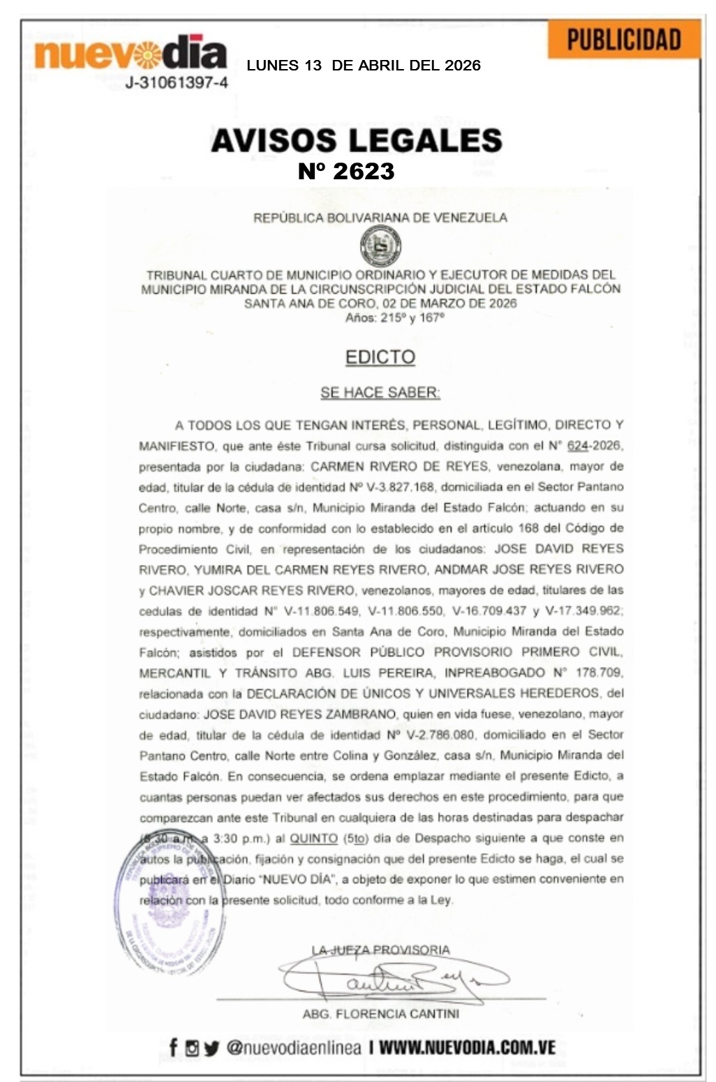 InicioPublicidadLegales PublicidadLegales Edicto.José David Reyes Zambrano. 13/04/2026 FacebookTwitterPinterestWhatsApp 2623. 13-04-2026 Cuota FacebookTwitterPinterestWhatsApp Artículo anteriorCapturado por acosar sexualmente a su hermana en CoroArtículo siguienteTrump arremete contra León XIV: «Es débil y terrible en política exterior» Mercadeo NuevoDia Noticias Relacionadas Legales Cartel de Notificación.Inversiones Jazmin.2019.C.A. Legales Cartel de Notificación.Copy Print.C.A. Legales Cartel de Notificación.Expert Inyectión Parts.C.A. Redes Sociales20,299FansMe gusta112,425SeguidoresSeguir4,600SuscriptoresSuscribirte Últimas noticias Destacadas 13-Abr | El precio del dólar abre en alza +DETALLES Nacionales Johel Orta: La AN debe acelerar la modificación de la Ley del Trabajo Cargar más