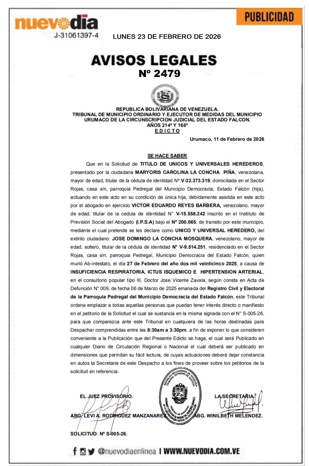 InicioPublicidadLegales PublicidadLegales Edicto.José Domingo La Choncha Mosquera. 23/02/2026 FacebookTwitterPinterestWhatsApp 2479. 23-02-2026 Cuota FacebookTwitterPinterestWhatsApp Artículo anteriorTras la muerte de ‘El Mencho’ esto dijo Claudia SheinbaumArtículo siguienteAndrés Mountbatten-Windsor habría usado dinero público para pagar viajes y masajes Mercadeo NuevoDia Noticias Relacionadas Legales Edicto.Alexandre Iskandar. Legales Cartel de Notificación.Inversiones Shekina V&J.C.A. Legales Cartel de Notificación.Comercial Alpez.C.A. Redes Sociales20,299FansMe gusta112,425SeguidoresSeguir4,600SuscriptoresSuscribirte Últimas noticias Destacadas Rodríguez: 11.000 personas recibirán medidas sustitutivas de privación de libertad bajo la Ley de Amnistía Destacadas Gobierno pide a EE.UU. en la ONU la liberación de Maduro y Cilia Flores Cargar más