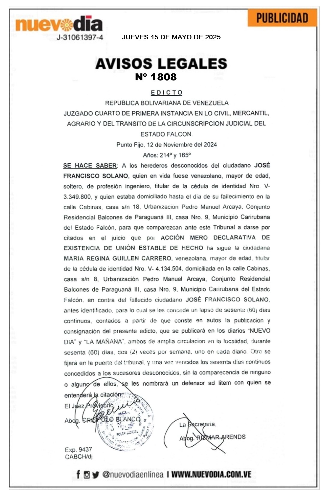 InicioPublicidadLegales PublicidadLegales Edicto.José Francisco Solano. 15/05/2025 FacebookTwitterPinterestWhatsApp 1808. 15-05-2025 Cuota FacebookTwitterPinterestWhatsApp Artículo anteriorPSUV convoca marcha por Día Internacional de la FamiliaArtículo siguienteMunicipio Sucre asegura la victoria revolucionaria del 25M en Falcón Mercadeo NuevoDia Noticias Relacionadas Legales Edicto.María Antonio Granadillo de Pulgar. Legales Cartel de Intimación.Oneyarlbert Corina González Lugo. Legales Edicto.Flora Beatriz Loyo de Toyo, José Angel Toyo Acosta, José Antonio Toyo Loyo, Jésus Israel Toyo Loyo, Yoel Rafael Toyo Loyo, Henry Gregorio Toyo... Redes Sociales20,299FansMe gusta112,425SeguidoresSeguir4,600SuscriptoresSuscribirte Últimas noticias Destacadas 67 % del presupuesto de 2026 en Carirubana será para inversión social Destacadas EE.UU. suspende vuelo de migrantes venezolanos previsto para este 12-Dic Cargar más