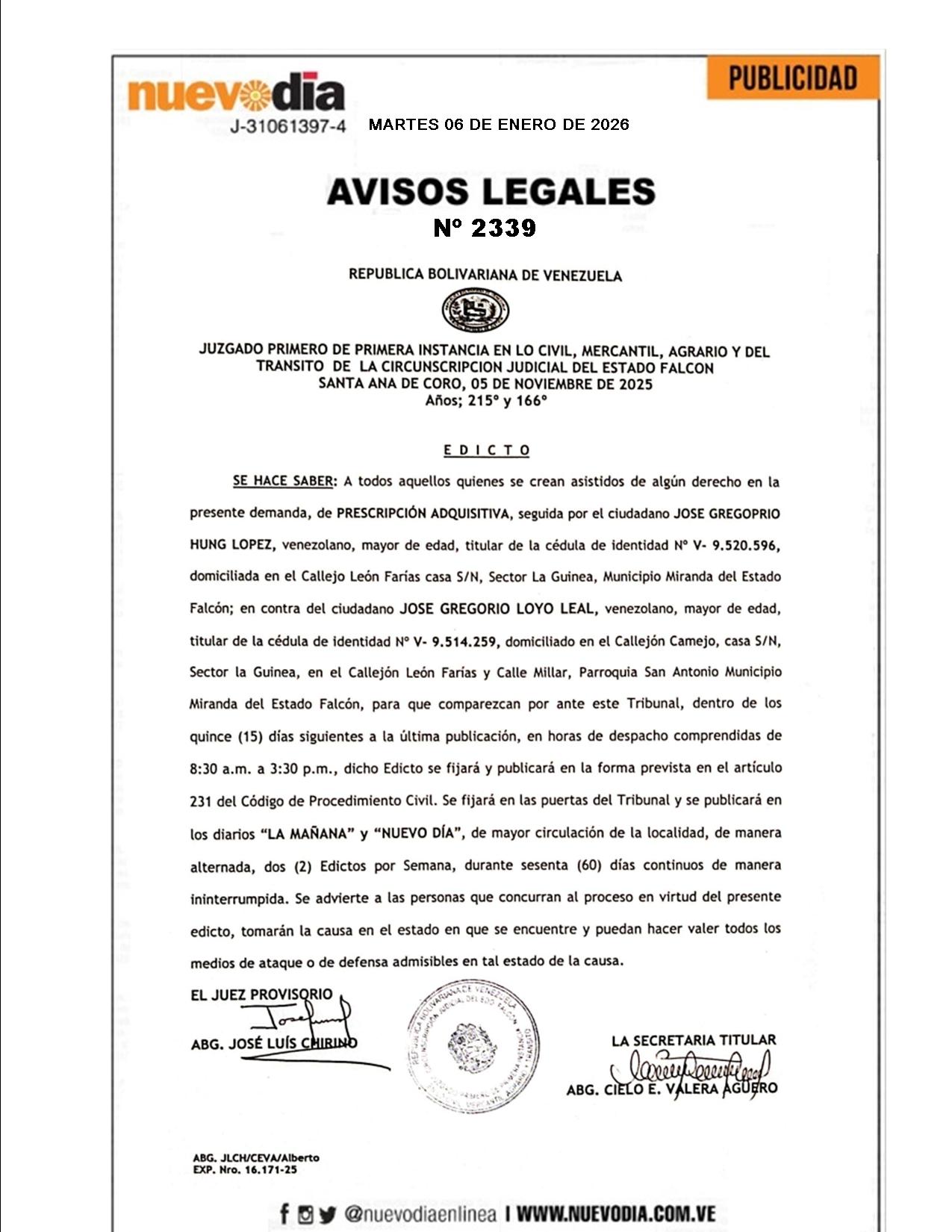 InicioSin categoria Sin categoria Edicto.José Gregorio Loyo Leal. 06/01/2026 FacebookTwitterPinterestWhatsApp 2339. 06-01-2026 Cuota FacebookTwitterPinterestWhatsApp Artículo anteriorPortada martes 6 de enero de 2026Artículo siguienteEste es el precio del dólar en Venezuela hoy 6-Ene Mercadeo NuevoDia Noticias Relacionadas Destacadas EE. UU. impone sanciones al comercio de armas entre Irán y Venezuela Sin categoria Edicto.Miguel Segundo Nava. Sin categoria Edicto.Antonio José Chirino Lugo y Jorge Federico Chirinos Lugo. Redes Sociales20,299FansMe gusta112,425SeguidoresSeguir4,600SuscriptoresSuscribirte Últimas noticias Destacadas Venezuela recibe nuevo cargamento de medicamentos oncológicos Destacadas Seniat recauda Bs. 226,2 millardos en diciembre de 2025 Cargar más